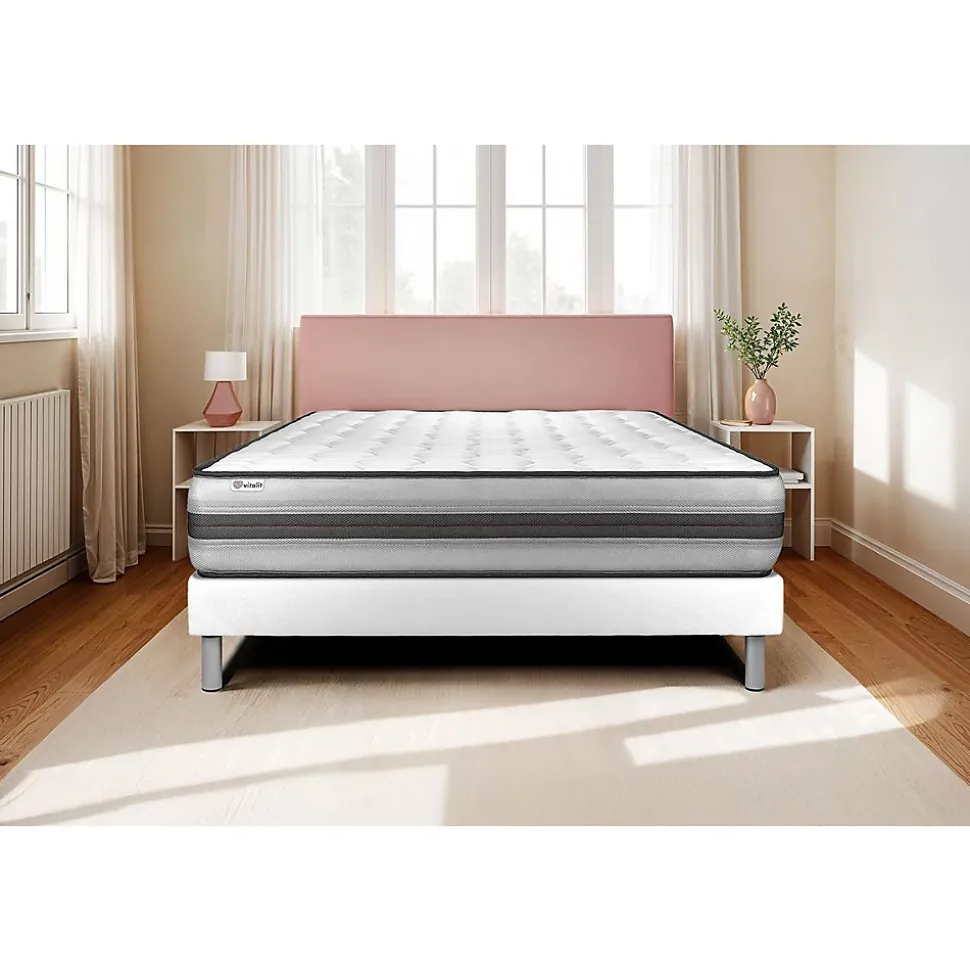 Faites le plein d’énergie positive grâce aux solutions de literie énergisantes Vitalit qui allient confort, maintien et souplesse et permettre à votre corps de prendre le temps de se revitaliser. Les matelas et sommiers Vitalit sont pensés pour s’adapter aux spécificités corporelles et au sommeil de chacun. De fabrication portugaise, les produits Vitalit sont rigoureusement élaborés selon des cahiers des charges précis. Jusqu’à la livraison, notre objectif : votre satisfaction.Avec ses 26 cm d’épaisseur, le matelas hybride haut de gamme VITALPOWER RECOVER bénéficie de l’alliance technologique des ressorts ensachés et mousse à mémoire de forme. D’un soutien ferme, son accueil enveloppant s’adapte à votre morphologie et allège les points de pression. Son coutil micro perforé garantie une aération optimisée. Recharger vos batteries durant votre sommeil avec le matelas VITALPOWER RECOVER.Type de matelas : Mémoire de forme et ressorts ensachésEpaisseur : 26 cmMicro perforé ultra-respirableCarénage mousse polyuréthane 30kgMousse polyuréthane à mémoire de forme D 55 kg + Mousse polyuréthane Soft HDFibres 100% Polyester 350G/M2Nombre de ressorts ensachés : 744 pour le 160x200cmPlate-Bande 3D micro-aérée 100% Polyester pour optimiser l’aération du matelasCoutil micro perforé ultra respirable 100% PolyesterConfort : Equilibré – Accueil moelleux – Soutien fermeFace de couchage : Face été / Face hiverDensité : 55 kg/m3Certification : Oeko-TexSommier tapissierMulti 12 lattes en peuplier massifStructure et traverses de renfort en peuplier massifGarnissage fibres 100% polyester 120G/M2Tissu Maille 100% polyester 260G/M2 respirableToile de fond 100% polyester anti-poussièresHauteur 14cm + Pieds acier 15cm (fournis)Adapté pour tous types de matelasLivré assemblé <