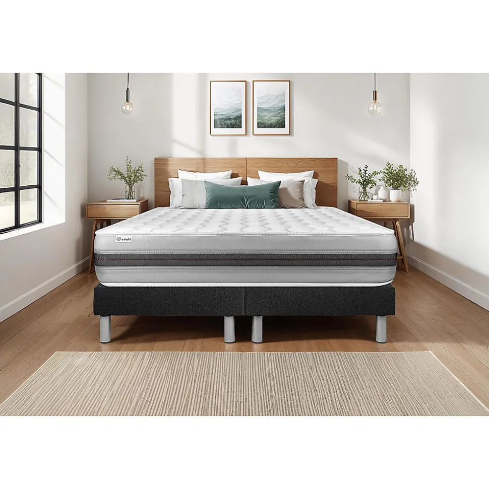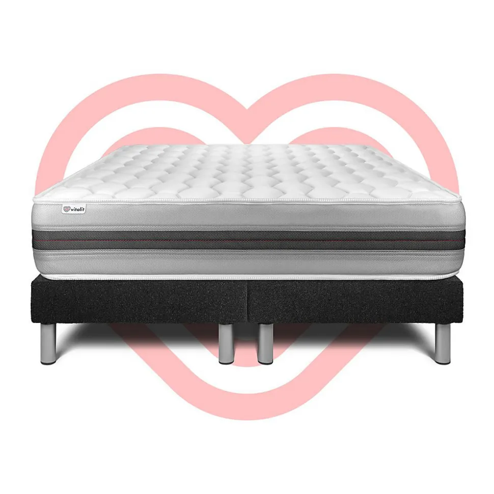 Faites le plein d’énergie positive grâce aux solutions de literie énergisantes Vitalit qui allient confort, maintien et souplesse et permettre à votre corps de prendre le temps de se revitaliser. Les matelas et sommiers Vitalit sont pensés pour s’adapter aux spécificités corporelles et au sommeil de chacun. De fabrication portugaise, les produits Vitalit sont rigoureusement élaborés selon des cahiers des charges précis. Jusqu’à la livraison, notre objectif : votre satisfaction.D’une maxi épaisseur de 28 cm, le Matelas hybride VITALSPRING RECOVER bénéficie de l’alliance des technologies ressorts et mousse à mémoire de forme. Les ressorts ensachés permettent un soutien ferme et une excellente indépendance de couchage et durable tandis que la mousse à mémoire de forme vous procure un accueil enveloppant. Son coutil micro perforé permet une aération optimisée.Epaisseur 28 cmÂme ressorts ensachés 17 cmNombre de ressorts ensachés : 744 pour le 160x200cmCarénage mousse polyuréthane 30kgMousse polyuréthane à mémoire de forme D 55 kg + Mousse polyuréthane Soft HDFibres 100% Polyester 350G/M2Coutil micro perforé ultra respirable 100% Polyester7 zones de confortConfort : ÉquilibréAccueil moelleuxSoutien fermeSommier tapissierMulti 12 lattes en peuplier massifStructure et traverses de renfort en peuplier massifGarnissage fibres 100% polyester 120G/M2Tissu Maille 100% polyester 855G/M2 respirableToile de fond 100% polyester anti-poussièresHauteur 14cm + Pieds acier 15cm (fournis)Adapté pour tous types de matelasLivré assemblé Epaisseur 28 cmÂme ressorts ensachés 17 cmNombre de ressorts ensachés : 744 pour le 160x200cmCarénage mousse polyuréthane 30kgMousse polyuréthane à mémoire de forme D 55 kg + Mousse polyuréthane Soft HDF