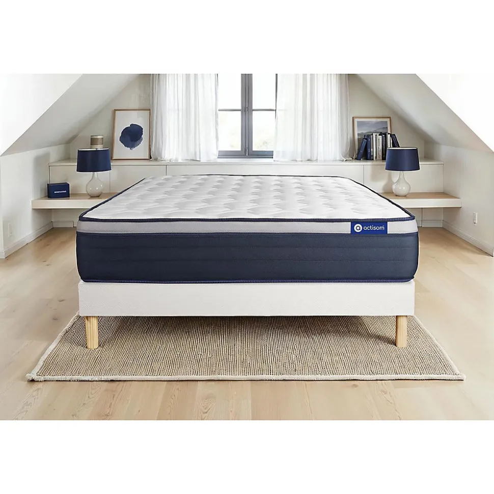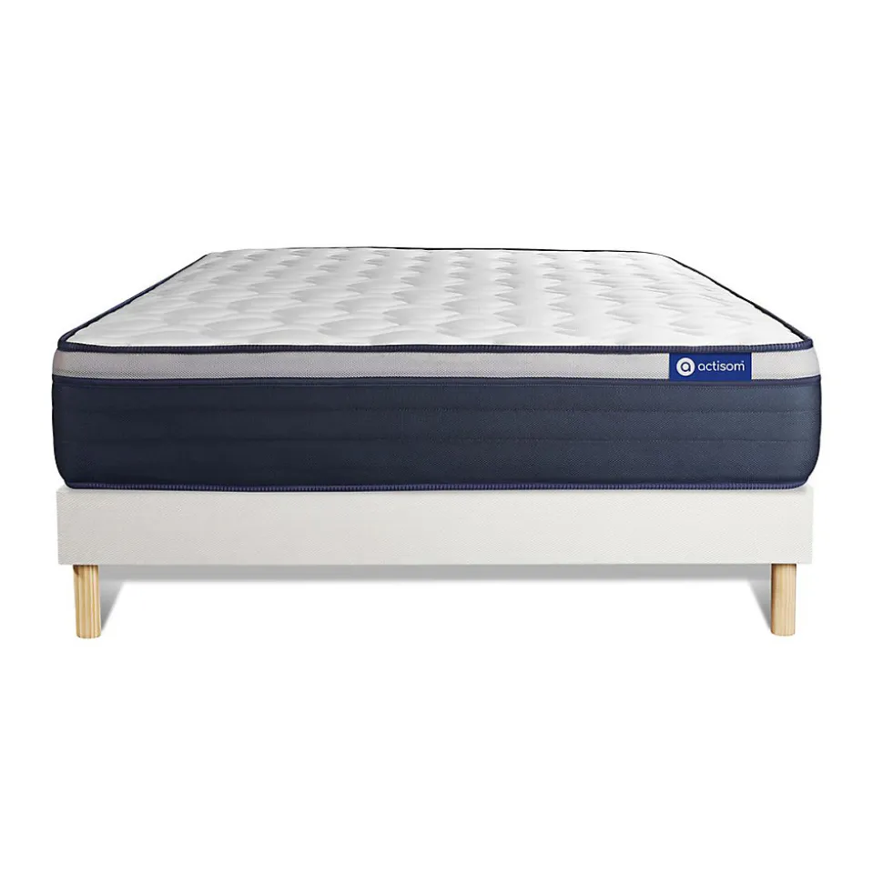 ACTISOM est une marque française développée en partenariat avec les plus grands experts européens du sommeil et de la literie. Après plusieurs années de recherche et de développement, nous avons mis au point des technologies innovantes (Actisoft – Actifresh – Acticell) afin de vous garantir d’excellentes nuits de sommeil. Tous nos matelas sont garantis 7ans et leur fabrication bénéficie d’un contrôle qualité très performant. Nos usines respectent les normes technologiques et environnementales européennes en vigueur.Le modèle Actiflex MAX de la marque ACTISOM vous offre un confort ferme pour une totale relaxation au fil des saisons grâce à ses 2 faces de couchages. La mousse à mémoire de forme en accueil associée à une ame en ressorts ensachés apporte un soutien morpholgique très précis pour une récupération optimale. Cette combinaison d’une maxi epaisseur de 26 cm vous assure un parfait maintien de la colonne vertébrale.Epaisseur 26 cmPlateau pour les 2 faces 4cm Mousse polyuréthane à mémoire de forme + mousse polyuréthane actiSoftAme 527 ressorts ensachés ferme 18cmCoutil 100% polyester micro-perforé ultra respirableConfort FermeType de sommier : Tapissier à lattes démontable à assembler soi mêmeÉpaisseur :14 cmStructure et traverses de renfort en pin massif15 lattes multiplisGarnissage fibres 100% polyester 120G/M2Tissu maille 100% polyester 260G/M2Pieds : Bois 15cm fournisMontage facile : le montage pourra être effectué par une personne seule en seulement 10 minutes Epaisseur 26 cmPlateau pour les 2 faces 4cm Mousse polyuréthane à mémoire de forme + mousse polyuréthane actiSoftAme 527 ressorts ensachés ferme 18cmCoutil 100% polyester micro-perforé ultra respirableConfort FermeType de sommier : Tapissier à lattes démontable à assembler soi mêmeÉpaisseur :14 c