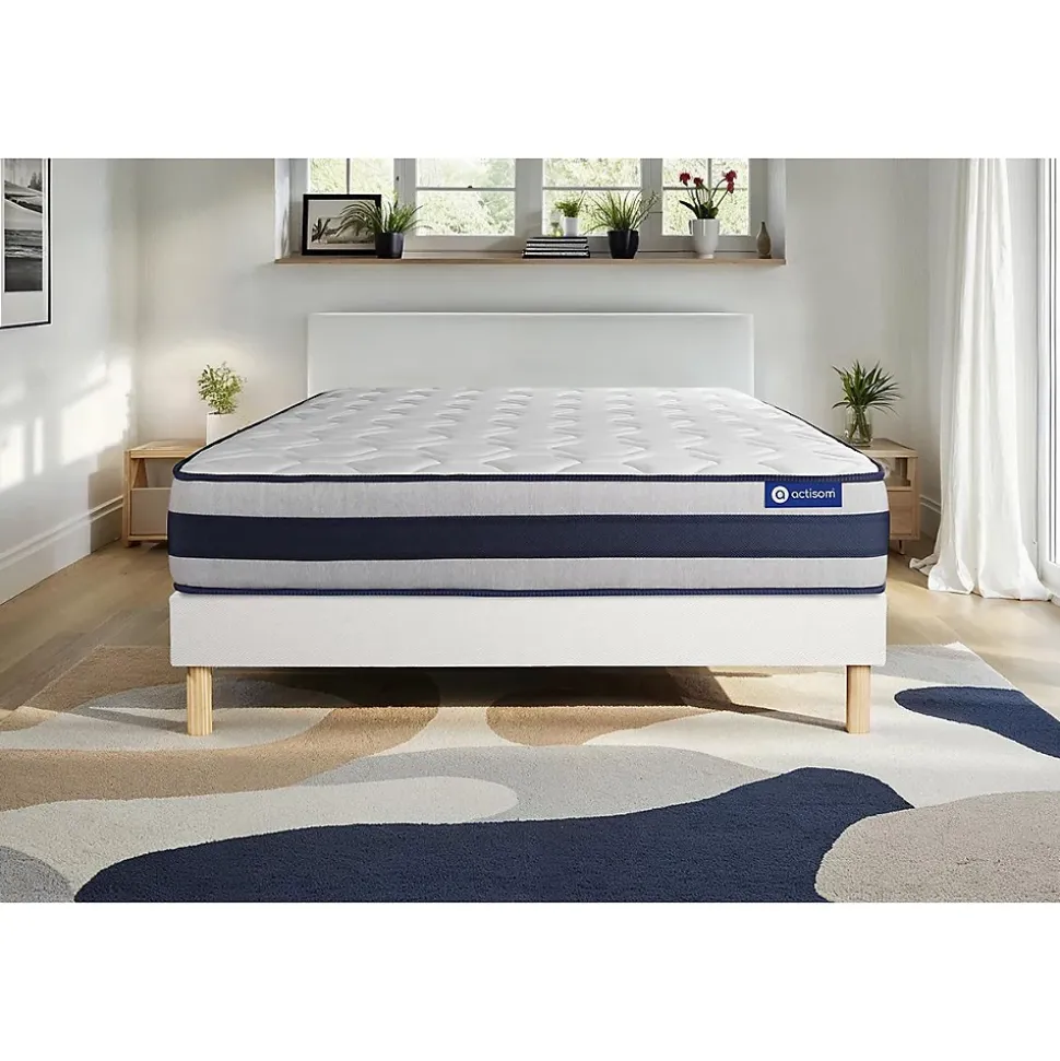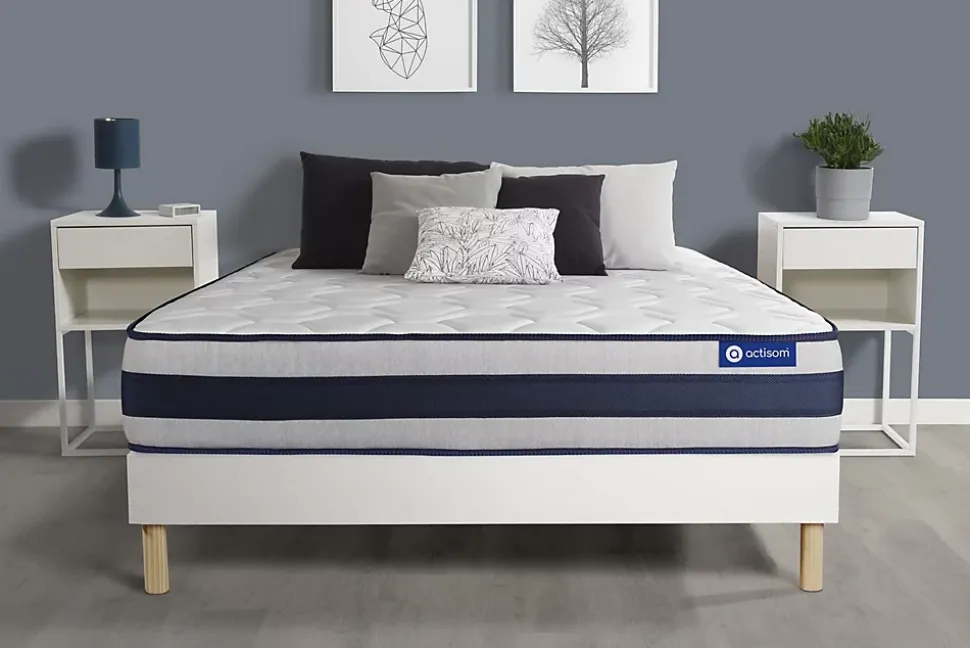 ACTISOM est une marque française développée en partenariat avec les plus grands experts européens du sommeil et de la literie. Après plusieurs années de recherche et de développement, nous avons mis au point des technologies innovantes (Actisoft – Actifresh – Acticell) afin de vous garantir d’excellentes nuits de sommeil. Tous nos matelas sont garantis 7ans et leur fabrication bénéficie d’un contrôle qualité très performant. Nos usines respectent les normes technologiques et environnementales européennes en vigueur.L’avis de notre expert: La combinaison parfaite entre un accueil à base de mousse à mémoire de forme et un souitien en ressorts ensachés. Le matelas Actiflex ERGO procure un accueil morphologique qui épouse la forme de votre corps et allége les points de pression. L’aération parfaite de ce matelas est notamment dûe à son soutien en ressorts ensachés et permet une régulation parfaite de la température ressentie.• Epaisseur 24 cm• Plateau pour les 2 faces 4cm Mousse polyuréthane à mémoire de forme + mousse polyuréthane actiSoft• Ame 961 ressorts ensachés ferme 18cm• Coutil 100% polyester micro-perforé ultra respirable• Confort Ferme• Type de sommier : Tapissier à lattes démontable à assembler soi même• Épaisseur : 14 cm• Structure et traverses de renfort en pin massif• 2×15 lattes multiplis• Garnissage fibres 100% polyester 120G/M2• Tissu maille 100% polyester 260G/M2• Pieds : Bois 15cm fournis• Montage facile : le montage pourra être effectué par une personne seule en seulement 10 minutes • Epaisseur 24 cm• Plateau pour les 2 faces 4cm Mousse polyuréthane à mémoire de forme + mousse polyuréthane actiSoft• Ame 961 ressorts ensachés ferme 18cm• Coutil 100% polyester micro-perforé ultra respirable• Confort Ferme• Type de sommier : Tapissier à lattes démontable à assembler soi même• Épaisseur : 14 cm• Structure et traverses de renfort en pin