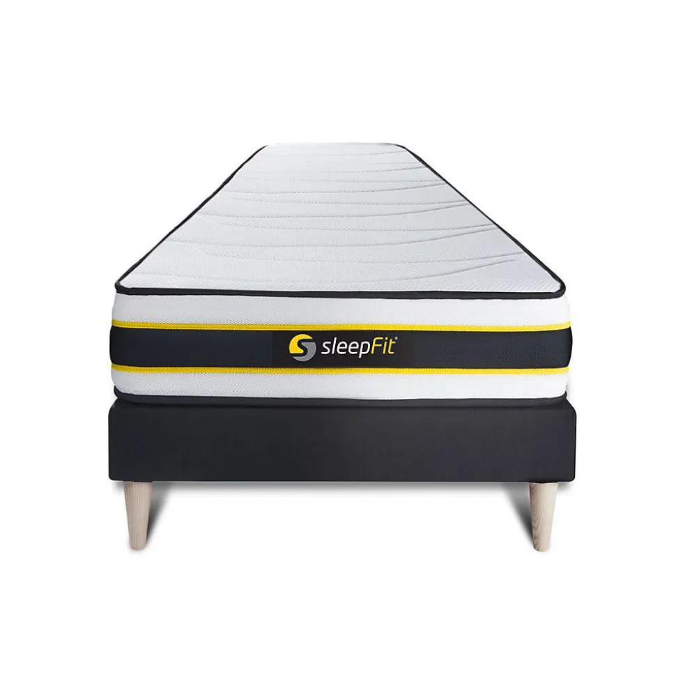 Sleepfit est une marque de matelas utilisés par les sportifs.Les matelas Sleepfit aspirent à vous offrir des nuits régénérantes et revitalisantes avec un soutien parfait du corps. Un matelas devrait toujours s’adapter à l’anatomie du corps et supprimer les points de pression susceptibles de bloquer la circulation sanguine. Quelle que soit votre morphologie vous obtiendrez une position de couchage idéale pour passer des nuits tranquilles, avec un sommeil de qualité propice à la décontraction musculaire.Le matelas FLEXY s’adapte à votre morphologie de sportif et procure un couchage de qualité en allégeant les points de pression. Le soutien équilibré point par point est apporté par les ressorts ensachés qui permettent une répartition homogène du poids du corps et une parfaite indépendance de couchage. L’accueil en mousse à mémoire de forme vise quant à elle à limiter les points de pression. Le corps a toutes les cartes en main pour se régénérer pendant la nuit et être d’attaque au réveil.- Type de matelas : Mémoire de forme et ressorts ensachés- Epaisseur : 22 cm- Confort : ferme- Accueil : Ferme avec mousse polyuréthane à mémoire de forme D55kg + mousse polyuréthane soft + Fibres 100% Polyester 350G/M2- Soutien : Ame 348 ressorts ensachés- Indépendance de couchage : Très bonne- Coutil : Tissu 100% polyester Micro perforé ultra-respirable- Bande latérale : Tissu 100 % polyester Micro perforé ultra-respirable- Face de couchage : Réversible- Certification : Label OEKO-TEX Standard 100- Nos matières premières sont certifiées par le label textile OEKO-TEX- Type de sommier : Sommier tapissier Monobloc- Nombre de lattes : Multi 12 lattes en peuplier massif- Structures et traverses de renfort en peuplier massif- Garnissage fibres 100% Polyester 120G/M2- Tissu Maille 100% polyester 260 G/M2- Toile de fond anti-poussières 100% polyester- Hauteur 14cm + Pie – Type de matelas : Mémoire de form
