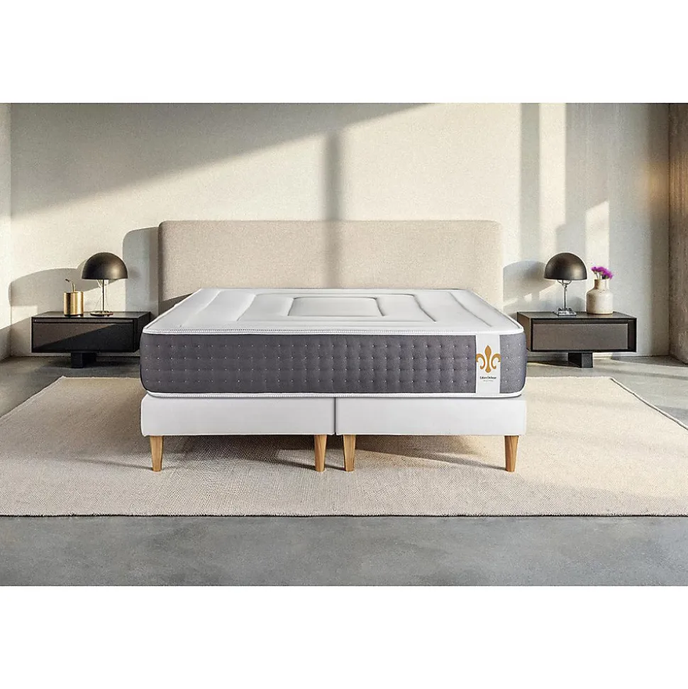 Produit à usage professionnel et particulier.Chez Litier Deluxe, nous souhaitons offrir à nos clients une expérience de couchage exceptionnelle en vous proposant une literie au confort luxueux.MATELAS :- Type de matelas : Matelas mémoire de forme et ressorts ensachés- Epaisseur : 26 cm- Confort: Ferme- 7 zones de confort- Face Hiver : 5 cm Mousse polyuréthane à Mémoire de forme D 55 kg + Mousse Polyuréthane Hypersoft- Face Eté : 4 cm Mousse polyuréthane Hypersoft + Fibres 100% Polyester- Ame ferme point par point avec une âme en ressorts ensachés de 17cm- Nombre de ressorts ensachés : 961- Carénage du bloc en ressorts ensachés en mousse polyuréthane HD 30kg- Indépendance de couchage : Excellente- Coutil ultra respirable 100% Polyester- Certification : Oeko-TexSOMMIER : – Type de sommier tapissier : monobloc- Épaisseur : 14 cm- Structures et traverses de renfort en peuplier massif- Nombre de lattes du sommier monobloc : 12 lattes en peuplier massif.- Garnissage fibres 100% polyester 120G/M2- Tissu maille 100% polyester 260G/M2- Pieds bois 15cm (fournis) MATELAS :- Type de matelas : Matelas mémoire de forme et ressorts ensachés- Epaisseur : 26 cm- Confort: Ferme- 7 zones de confort- Face Hiver : 5 cm Mousse polyuréthane à Mémoire de forme D 55 kg + Mousse Polyuréthane Hypersoft- Face Eté : 4 cm Mousse polyuréthane Hypersoft + Fibres 100% Polyester- Ame ferme point par point avec une âme en ressorts ensachés de 17cm- Nombre de ressorts ensachés : 961- Carénage du bloc en ressorts ensachés en mousse polyuréthane HD 30kg- Indépendance de couchage : Excellente- Coutil ultra respirable 100% Polyester- Certification : Oeko-TexSOMMIER : – Type de sommier tapissier : monobloc- Épaisseur : 14 cm- Structures et traverses de renfort en peuplier massif- Nombre de lattes du somm