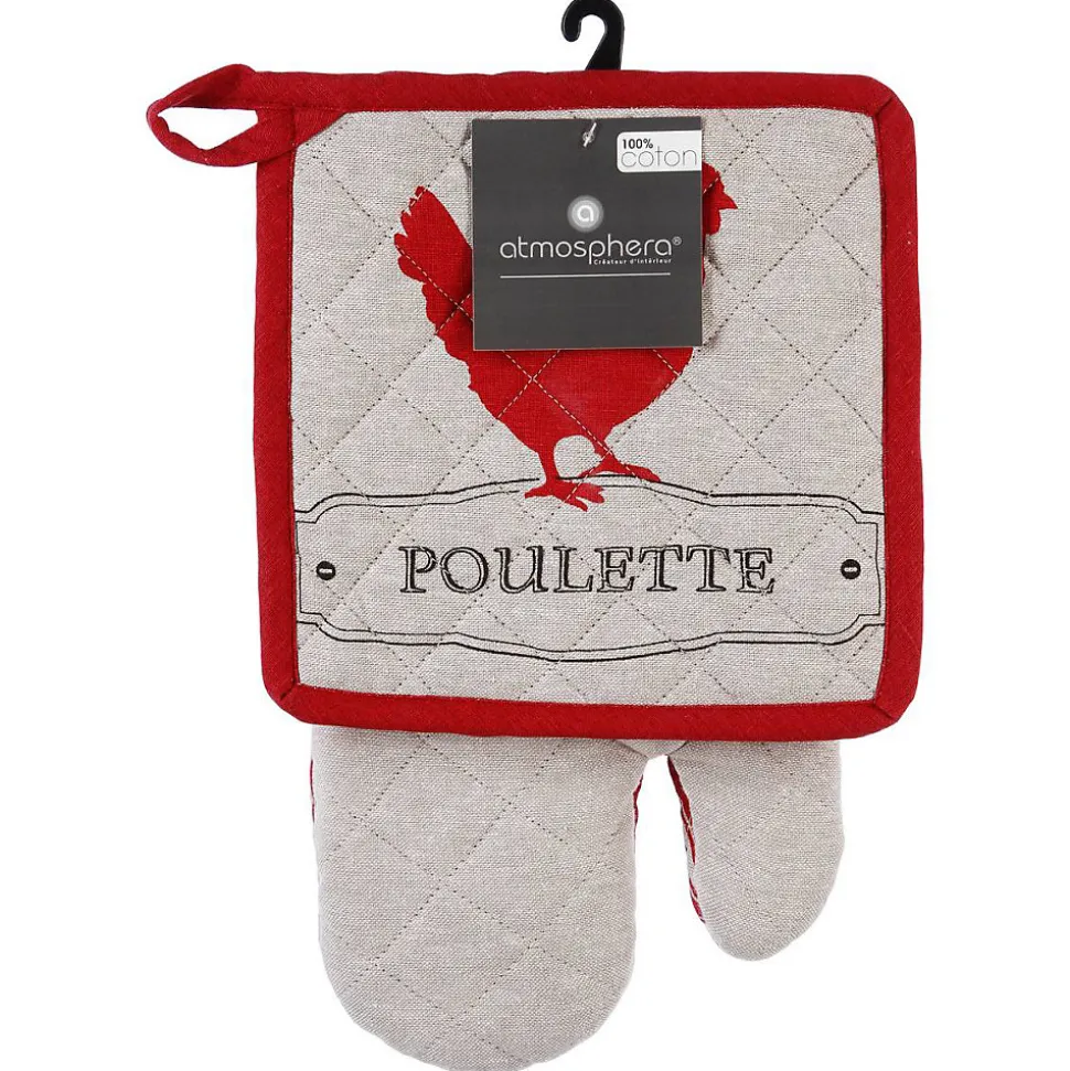Offrez-vous le gant et manique « poule » Atmosphera ! Ludique et indispensable, il déposera une touche vintage dans une cuisine au style rétro.Un duo pratique et authentiqueCe gant et manique « poule » est composé d’un gant et d’une manique en pur coton. Réalisés dans un tissage brut et naturel, ils sont sobrement bordés d’un liseré de couleur et sont imprimés d’une poule colorée, perchée sur une petite plaque. Munis d’attaches permettant de les suspendre à des crochets, ils sont lavables en machine.Coordonnez votre gant et manique « poule » à un set de torchons Atmosphera issus de la même collection afin d’harmoniser votre déco avec une touche intemporelle.Le petit plus décoCollectionnez des poules déco que vous chinerez en brocante et placez-les sur une étagère afin de créer une ambiance chaleureuse.