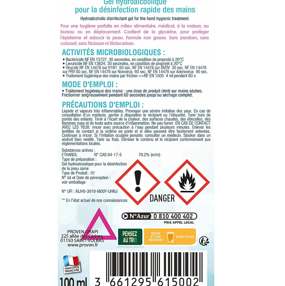 Le gel hydro-alcoolique Wyritol est une solution de désinfection des mains par friction, sans eau, sans rinçage et sans essuyage. Idéal pour l’hygiène des mains au quotidien, ce gel antiseptique élimine efficacement les bactéries, les levures et certains virus grâce à son action bactéricide, levuricide et virucide. Formulé sans parfum, sans allergène et sans paraben, il respecte les peaux sensibles et limite les risques d’irritation. Son format pratique de 100 ml permet un usage nomade, à la maison, au bureau ou en déplacement. Le gel Wyritol est un allié essentiel pour garantir une hygiène des mains optimale, notamment en période épidémique. Grâce à sa formule sans résidu, il sèche rapidement et laisse les mains propres, douces et protégées.