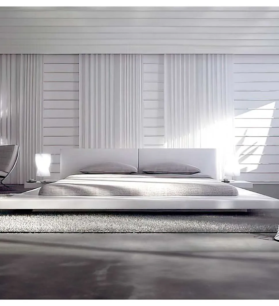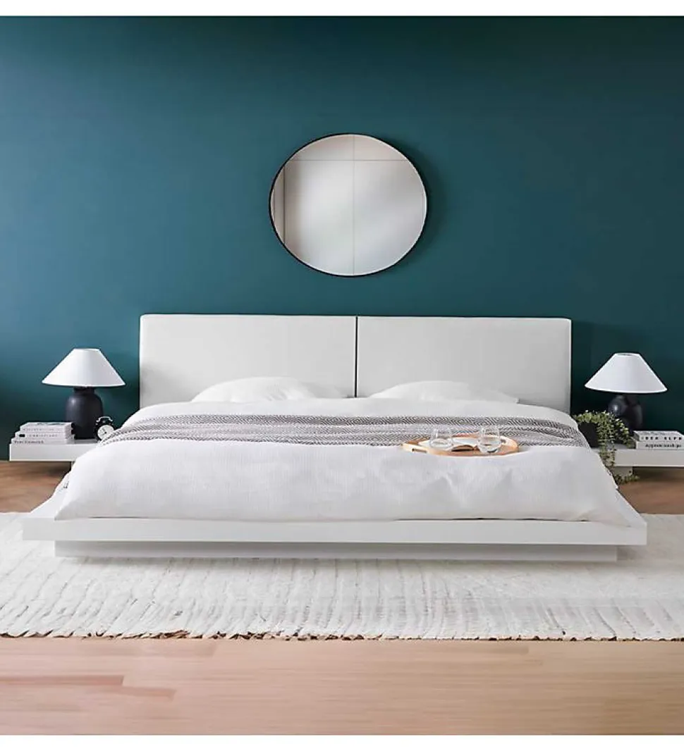 Lit plateforme en simili cuir et bois laqué blanc avec tables de chevets intégréesCaractéristiques du lit plateforme :Modèle : Lit plateforme design avec chevets intégrésRevêtement : Cuir synthétique blanc 100 % polyuréthaneInclus :Traverse centrale autoportante (permet d’utiliser 1 grand matelas ou 2 petits)Matelas non inclusDimensions :Dimensions totales du lit incluant chevet : 302 cm (L) x 72 cm (H) x 231 cm (P)Surface de couchage : 180 x 200 cmHauteur du cadre de lit : 22 cmHauteur de la tête de lit : 67 cmProfondeur d?insertion pour sommier à lattes : 7 cmDimensions des chevets : 40 cm x 40 cm chacunCe que nous aimons dans ce lit plateforme :Ce lit plateforme est une véritable perle du design contemporain. Son look bas et épuré, combiné à des chevets parfaitement intégrés, crée une atmosphère moderne et harmonieuse dans la chambre. La faible hauteur du cadre renforce l’effet visuel aérien, tandis que le cuir synthétique blanc apporte une touche de luxe tout en étant facile à entretenir. Grâce à la traverse centrale, vous pouvez choisir entre un seul grand matelas ou deux petits avec différentes fermetés Ce lit est bien plus qu?un simple couchage : c?est une pièce maîtresse pour un espace nuit élégant et personnalisé.
