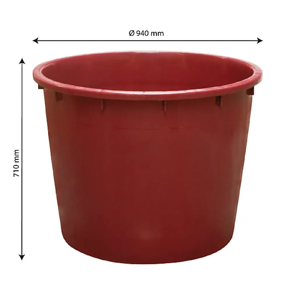 Baquet rond renforcé en plastique alimentaire (PEHD).Grand baquet avec de larges rebords pour faciliter la prise en main.Baquet emboîtable pour un encombrement minimum lors du stockage à vide, sans effet ventouse. Ce baquet polyvalent de grande contenance est renforcé est conçu pour supporter une forte charge et adapté à un usage intensif professionnel. Ce grand bac rond est très polyvalent, parfait en viniculture comme bassine oenologique pour recueillir le moût soutiré et le transporter. En agriculture, il est largement utilisé en mangeoire ou abreuvoir pour les animaux. Il répond à l’ensemble des normes de sécurité alimentaire et vous accompagnera ment. Hauteur 710 mm Diamètre 940 mm Contenance 350 litres Hauteur intérieure bas produit 690 mm Diamètre intérieur produit 720 mm Poids 8.7 kg