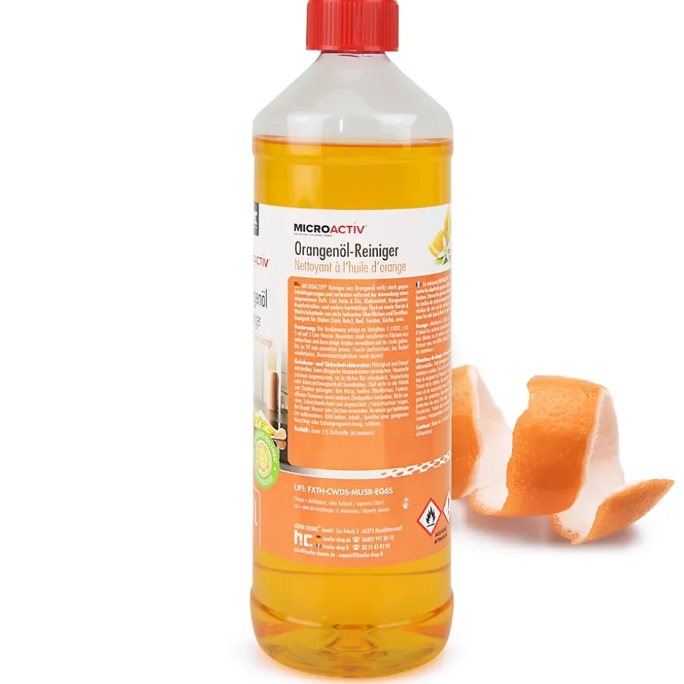 1 L Microactiv Nettoyant à l’huile d’orange concentréLe nettoyant à l’huile d’orange du monde du shopping en ligne de Höfer Chemie peut être utilisé de manière universelle dans toute la maison. Le nettoyant à l’huile d’orange concentré en bouteille de 1 litre est dilué dans de l’eau dans un rapport allant jusqu’à 1 : 1.000. L’excellent pouvoir dégraissant de ce nettoyant à l’huile d’orange hautement concentré est utilisé non dilué contre les salissures particulièrement tenaces.Voici l’effet du nettoyant à l’huile d’orange dans la pratiqueLe nettoyant à l’huile d’orange agit fortement contre les dépôts de graisse et diffuse pendant l’utilisation un agréable parfum de fruits du Sud mûrs. La dilution individuelle du nettoyant concentré à l’huile d’orange Microactiv avec de l’eau permet d’agir avec précision sur l’intensité d’une salissure. Lors du nettoyage des sols, les éclaboussures de graisse sont dissoutes de manière fiable, le nettoyant à l’huile d’orange de l’offre de Höfer Chemie prévient en même temps une nouvelle salissure par la graisse. L’effet de ce produit de nettoyage naturel au parfum d’orange peut être intensifié en ajoutant simplement de l’eau.Utilisation du nettoyant à l’huile d’orange : contre quelles salissures le concentré est-il efficace ?Le nettoyant ménager universel peut également être utilisé dans la voiture pour assurer un nettoyage en profondeur avec un air ambiant agréable. Le nettoyant à l’orange de la boutique Höfer Chemie est traditionnellement utilisé contre ces types de salissures :dissolution de graisses et d’huilesde nombreuses substances adhésives sont éliminées par le nettoyant à l’orange concentréLe nettoyant à l’huile d’orange Microactiv aide à décoller rapidement le chewing-gum, aussi bien des surfaces que des tissus.les taches de stylo à bille et autres taches tenaces peuvent être traitéesle concentré intensif disso…