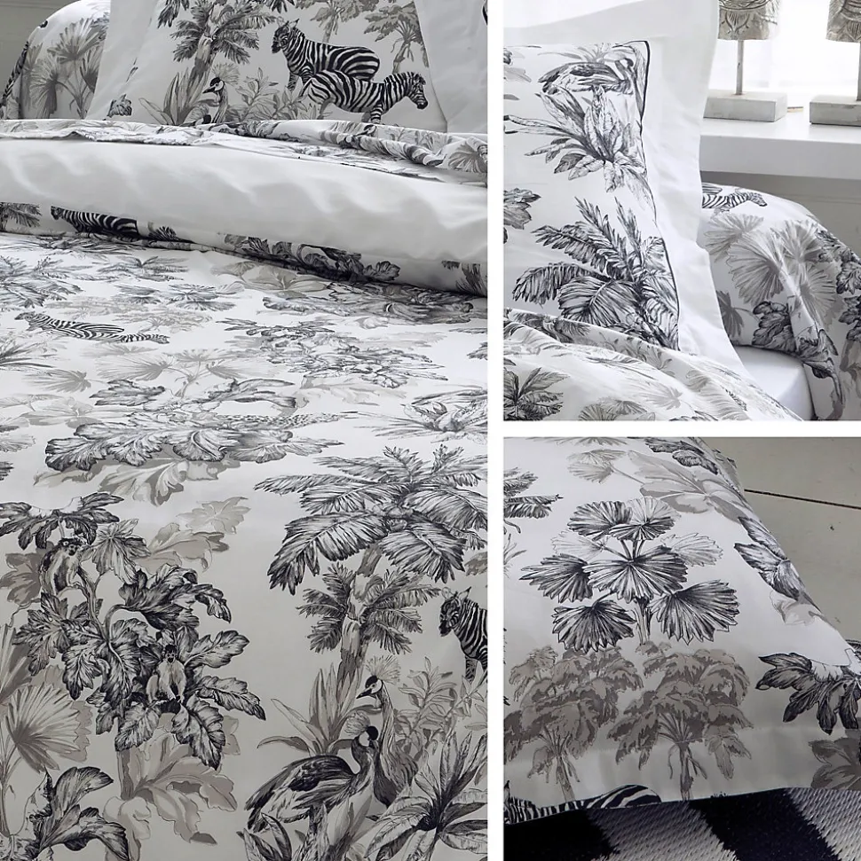 - Housse de couette 140×200 cm satin de coton 110 fils/cm² SAVANE blanc Parure de lit en satin de coton très qualitative et haut de gamme. Ambiance contemporaine avec cette végetation exotique et animaux (cachés) dans des tons de noir sur fond blanc.