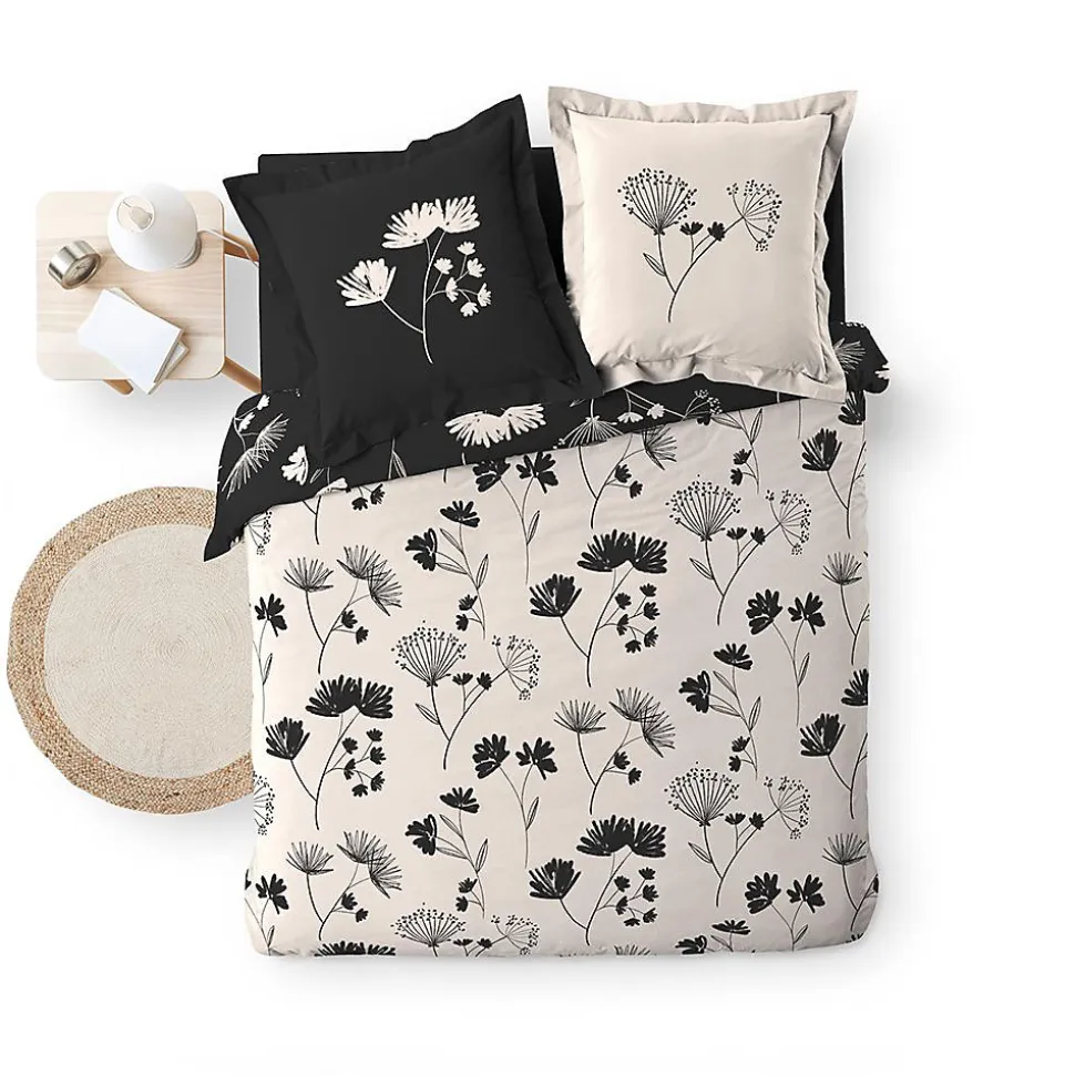 Donnez une allure champêtre et élégante à votre lit double avec la parure Iris. Fabriquée en percale 78 fils, elle garantit un confort exceptionnel grâce à son tissage doux et raffiné. Avec ses motifs floraux noirs sur fond blanc, et son côté réversible qui propose un style épuré avec des dessins subtils, cette parure s’intègre parfaitement à une décoration à la fois chic et naturelle.Composition : 100% Percale de cotonInstructions : Lavage à 40° – Séchage modéré – Repassage à 150°
