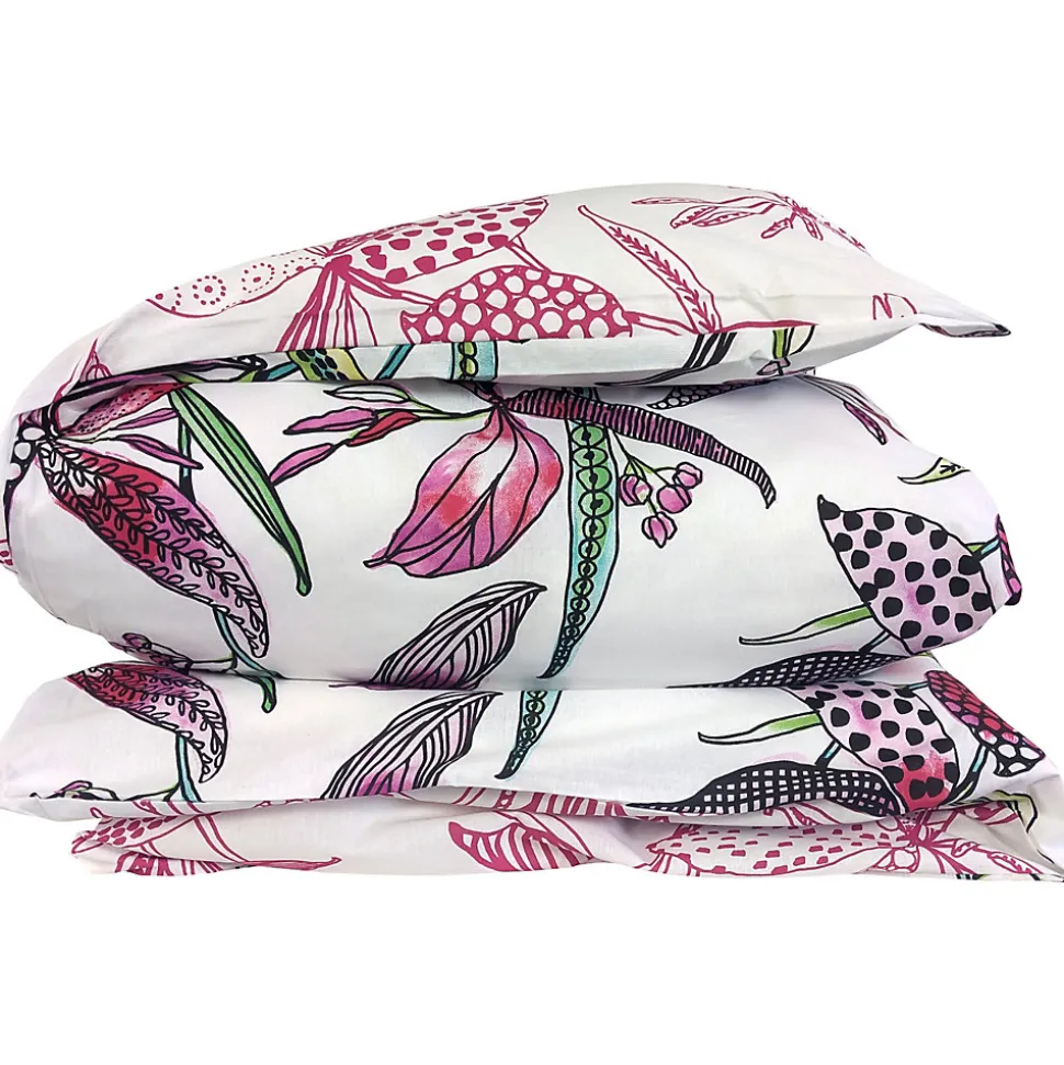 - Parure de lit 100% coton avec imprimé de fleurs colorées hautes en couleur rose, vert, bleu et gris sur fond blanc.