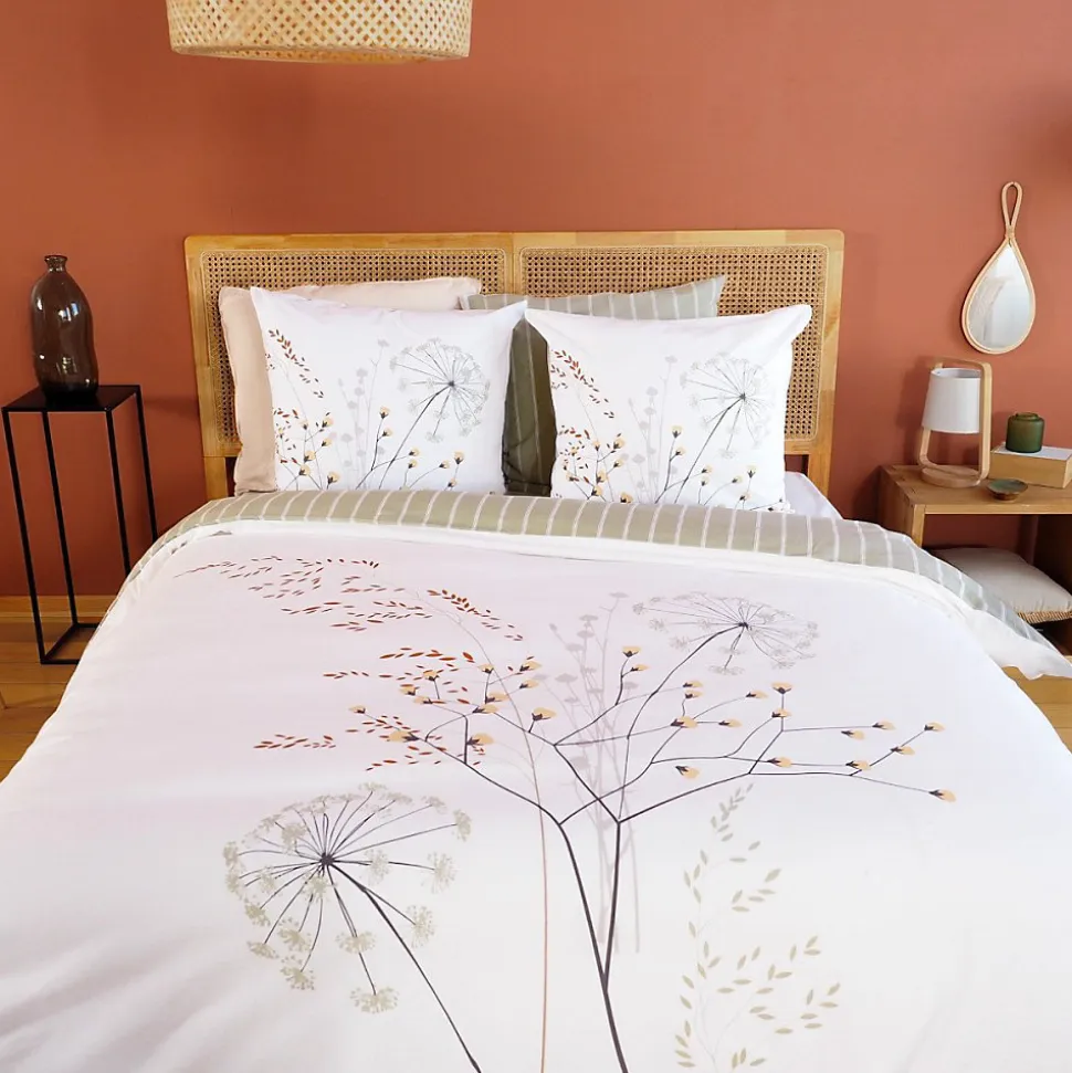 Habillez votre lit grâce à cette très belle housse de couette SOLIFLORE au motif réversible qui vous permettra de changer de décoration tout en gardant la même housse de couette.Fabriquée en coton au tissage serré 57fils/cm2 ; c’est une matière naturelle gage de confort et de douceur.Cette parure de couette imprimée SOLIFLORE 3 pièces est composée de :1 housse de couette 240×220 cm réversible avec fermeture boutons et fente passe-mains;2 taies d’oreiller 63×63 cmCette ensemble de linge de lit est constituée de fibres 100% coton au tissage serré 57fils/cm2.Standard OEKO-TEX- Made in green ; Label de confiance qui garantit l’absence de substances nocives et une fabrication par des entreprises responsables.