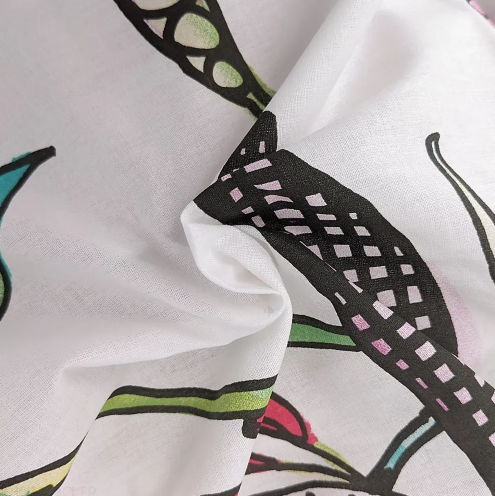 - Parure de lit 100% coton avec imprimé de fleurs colorées hautes en couleur rose, vert, bleu et gris sur fond blanc.
