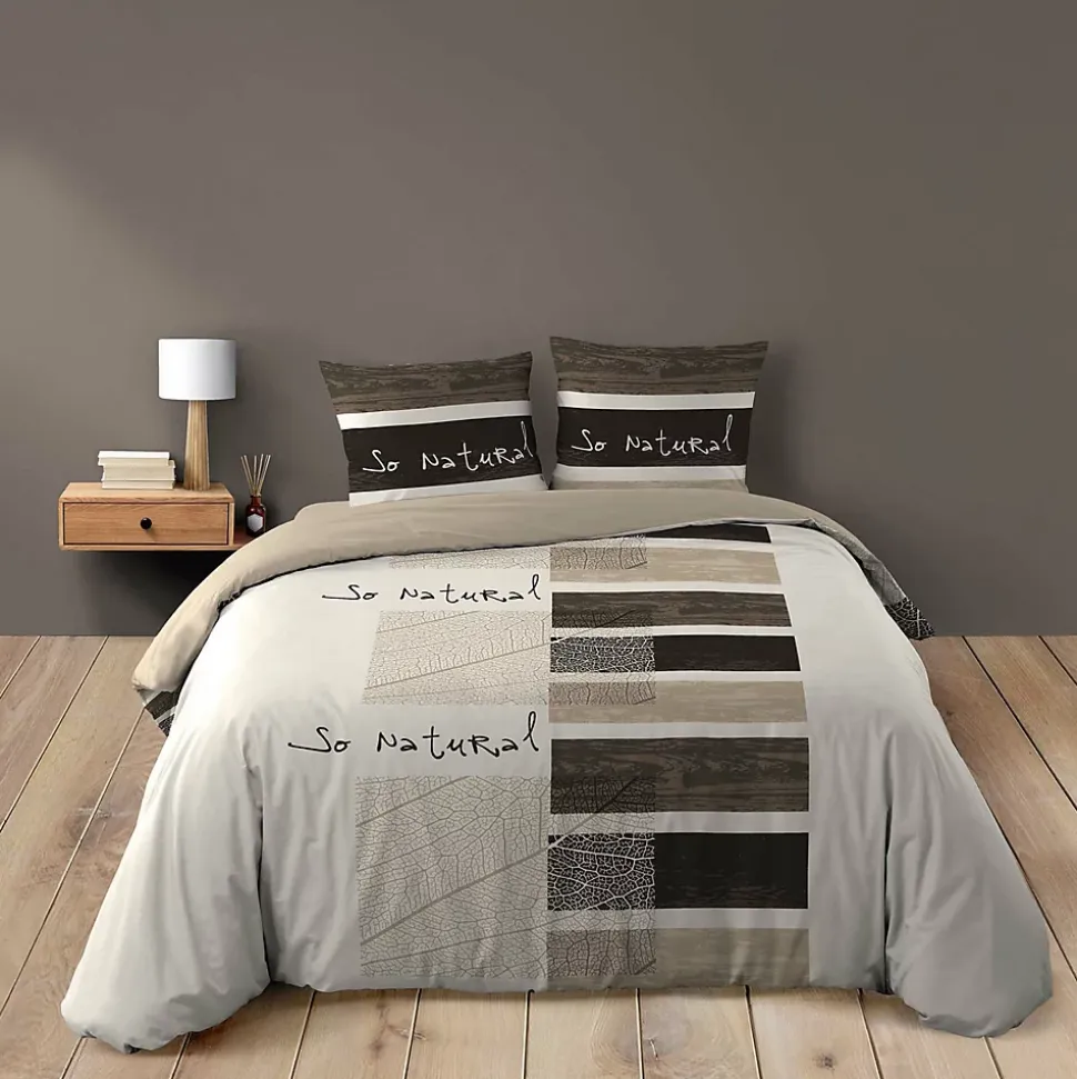 Apportez une touche authentique et apaisante à votre chambre avec cette parure de lit 3 pièces So Natural. Composée d’une housse de couette 260 x 240 cm et de 2 taies d’oreiller assorties 63 x 63 cm, elle est confectionnée en pur coton 42 fils/cm², une matière respirante et agréable au toucher.• Composition : 100 % coton – 42 fils/cm²• Dimensions housse : 260 x 240 cm – lit King size• Dimensions taies : 2 taies d’oreiller 63 x 63 cm incluses• Motif : imprimé graphique « So Natural » – esprit nature et bois• Finition : fermeture à boutons• Entretien : lavable en machine à 40° – séchage facile