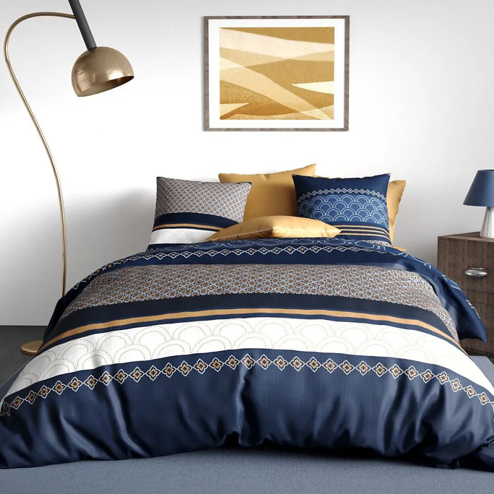 Très belle housse de couette KALYPSO pour lit 2 personnes de dimensions 260×240 cm en 100% coton au tissage très serré 57 fils avec ses 2 taies d’oreillers 63×63 cm.Dimensions housse de couette : 260×240 cmDimensions des taies d’oreiller : 63×63 cmFinition : housse de couette fermeture boutons et taies portefeuilleMatière : 100% coton 57 fils/cm² En coton; un tissu souple et résistant de qualité supérieure grâce à son tissage ultra serré de 57fils/cm2.Housse de couette et taies d’oreiller lavable à 40 degrés.Produit certifié Oeko-Tex; le label garantit que les articles testés et certifiés ne présentent pas de substances nocives pouvant nuire à la santé.