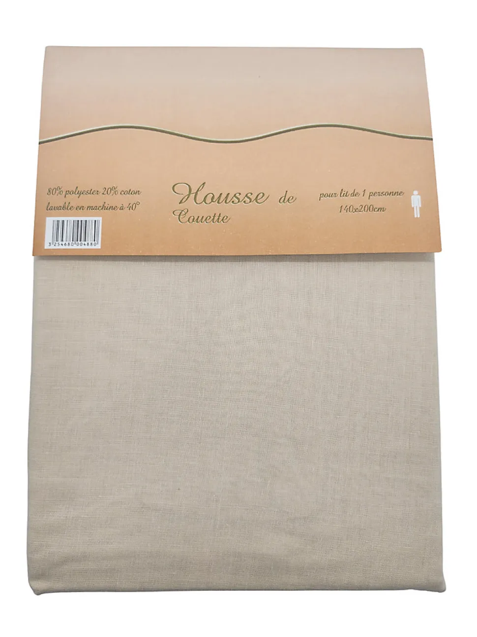 Housse de couette – 1 personne 140 x 200 Colori : TaupeTissu : Polycoton (80% Polyester + 20% Coton)Fermeture Portefeuille pratique et facileVendue sans les taies d’oreillersLavable à 40°C