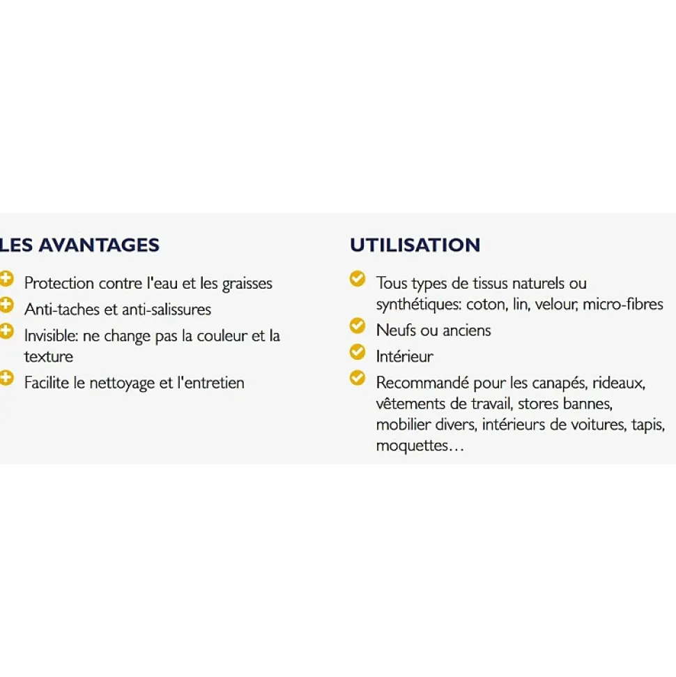 - UN PRODUIT ÉCONOMIQUE QUI N’ALTÈRE PAS LE TEXTILE : Ce produit hydrofuge antitache agit en profondeur et en surface sans altérer ni modifier l’aspect du tissu, de la moquette ou du cuir, tout en leur donnant une résistance exceptionnelle aux frottements. Ce produit hydro-oléofuge en aérosol de 400 ml peut facilement couvrir 5m2 de tissu, daim ou cuir, 4m2 de tapis ou de moquette.