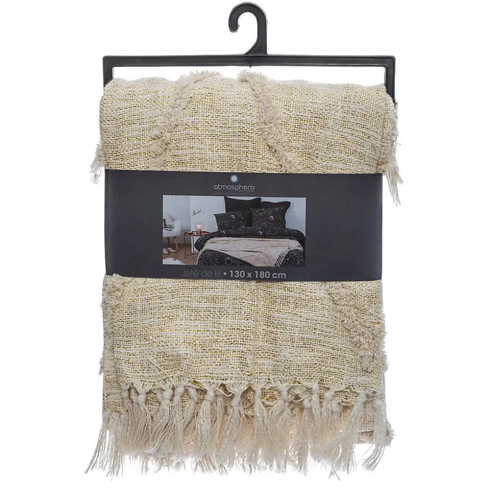 Le jeté de lit « Shine » Atmosphera convient à tous vos moments de détente. Le ethnique stylisé Le jeté de lit « Shine » possède un style ethnique avec sa toile de coton texturée enrichie de différents motifs tuftés en 3D. Les fils de lurex dorés tissés dans la toile et les bords décorés de franges ajoutent une touche d’originalité. Le petit plus décoPour un contraste élégant, associez ce jeté de lit à des coussins Atmosphera en velours aux finitions dorées.