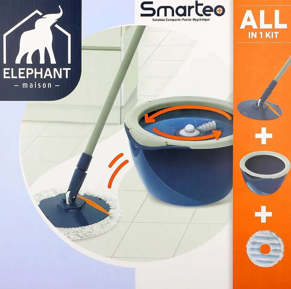 Le nettoyage de vos sols devient bien plus facile avec Smarteo. Ce petit équipement astucieux prendra très peu de place chez vous. Le meilleur moyen de vous doter de tout ce dont vous avez besoin. > Idéal pour s’équiper totalement, le kit Smarteo contient 1 balai espagnol à système rotatif, 1 housse en microfibre ultra absorbante, 1 seau avec essoreur hygiénique intégré. Silencieux. Ultra compact, sable et conçu pour éviter les éclaboussures. Platine pliable : idéale plinthes et contremarches d’escalier. Essoreur hygiénique : doté de peignes grattants, il essore et nettoie la housse en même temps. Balai facile à assembler.
