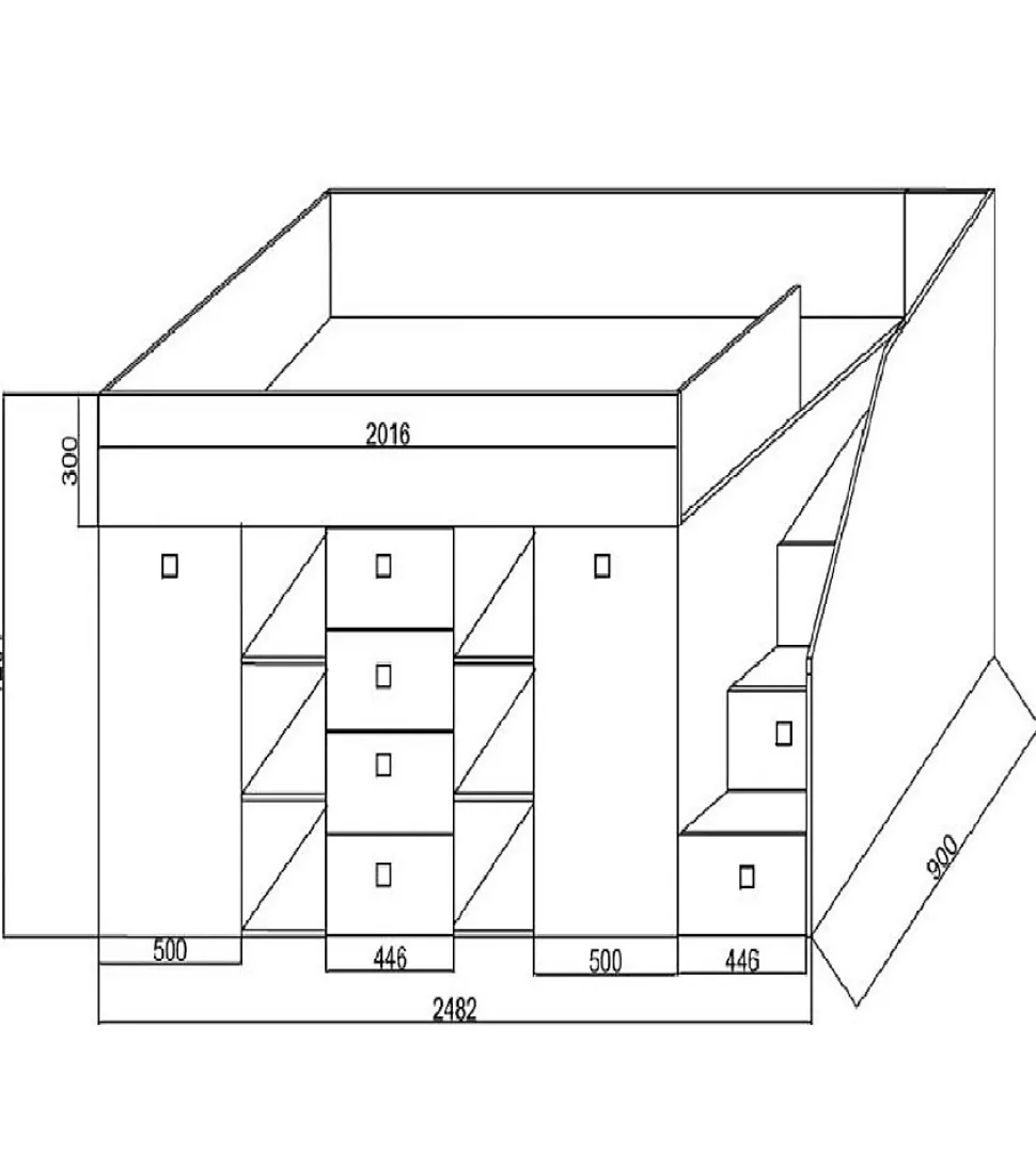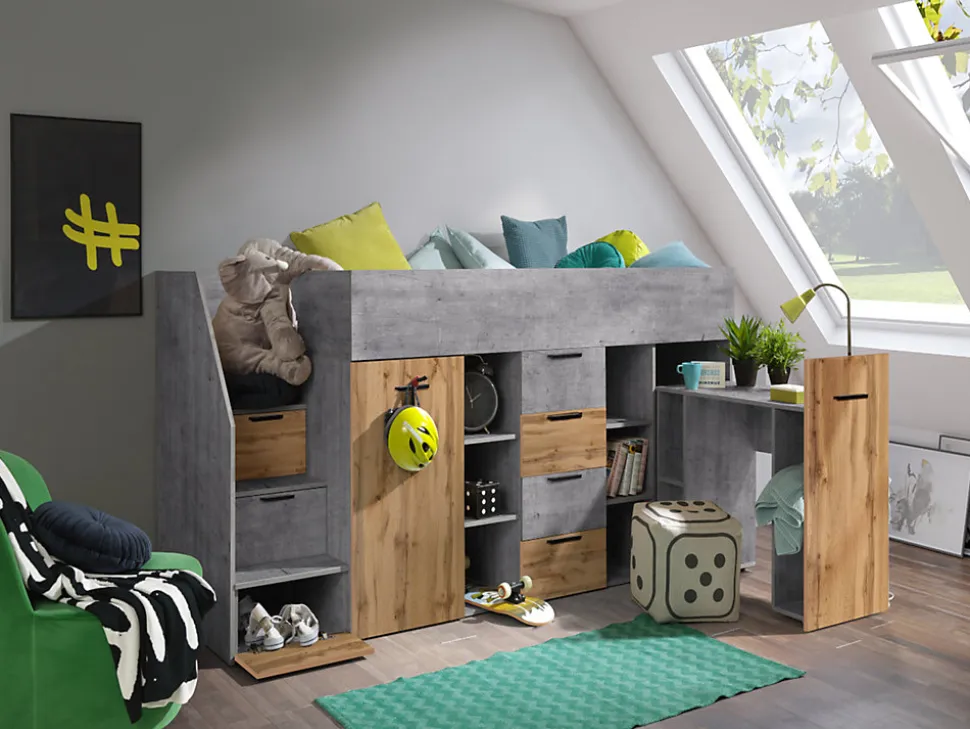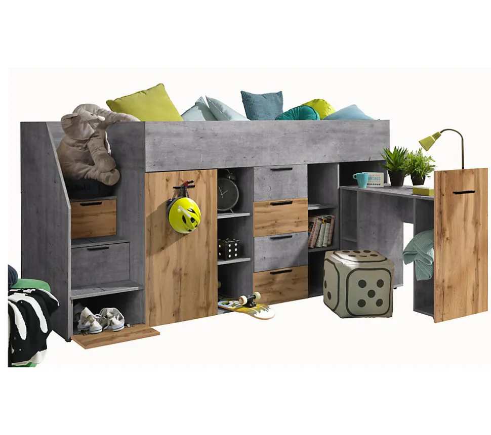 Meuble Multifonctionnel:Nous vous proposons une solution révolutionnaire – le lit superposé avec bureau coulissant, armoire, étagères ouvertes, 4 tiroirs et des marchepieds avec battants orientés vers le bas et espace de rangement. Vous pouvez choisir le côté pendant le montage. Ce meuble moderne vous permettez d’avoir tous les objets nécessaires à portée de la main. Le côté du lit doit être choisi lors de la commande. Lit Superposé pour Chambre Ado:Le lit superposé est un meuble nécessaire dans une chambre d’enfant ou d’adolescent. Cette option est très confortable, parce que vous pouvez optimiser l’espace de la chambre et gagner de la place, ce qui est excellent pour les petits espaces. Spécifications Techniques:largeur : 248,5 cm,hauteur : 123 cm,profondeur : 93 cm.Espace de couchage : 90 x 200 cm.Dimensions supplémentaires : bureau (largeur – 88 / hauteur – 76 / profondeur – 45,5 cm / espace pour les jambes – 50 cm), armoire : largeur – 46,4 / hauteur – 88,9 / profondeur – 93 cm, hauteur du rail supérieur – 30 cm. Construction Solide:Le lit superposé est fabriqué en plateau stratifiée d’épaisseur 16 mm, chants finis avec un placage en PVC durable et résistant à l’usage quotidien, dos du meuble en panneau HDF, les tiroirs se déplacent sur des glissières à rouleaux, poignées en MDF. Livraison et Montage:Attention ! Notre entreprise de transport n’offert pas la possibilité de monter par l’escalier sur l’appartement et n’offert pas le service de montage. Les meubles sont livrés dans les paquets avec l’instruction de montage soi-même. La livraison est sur la palette. Information téléphonique sur la date de livraison. Veuillez demander un numéro de contact actualisé.