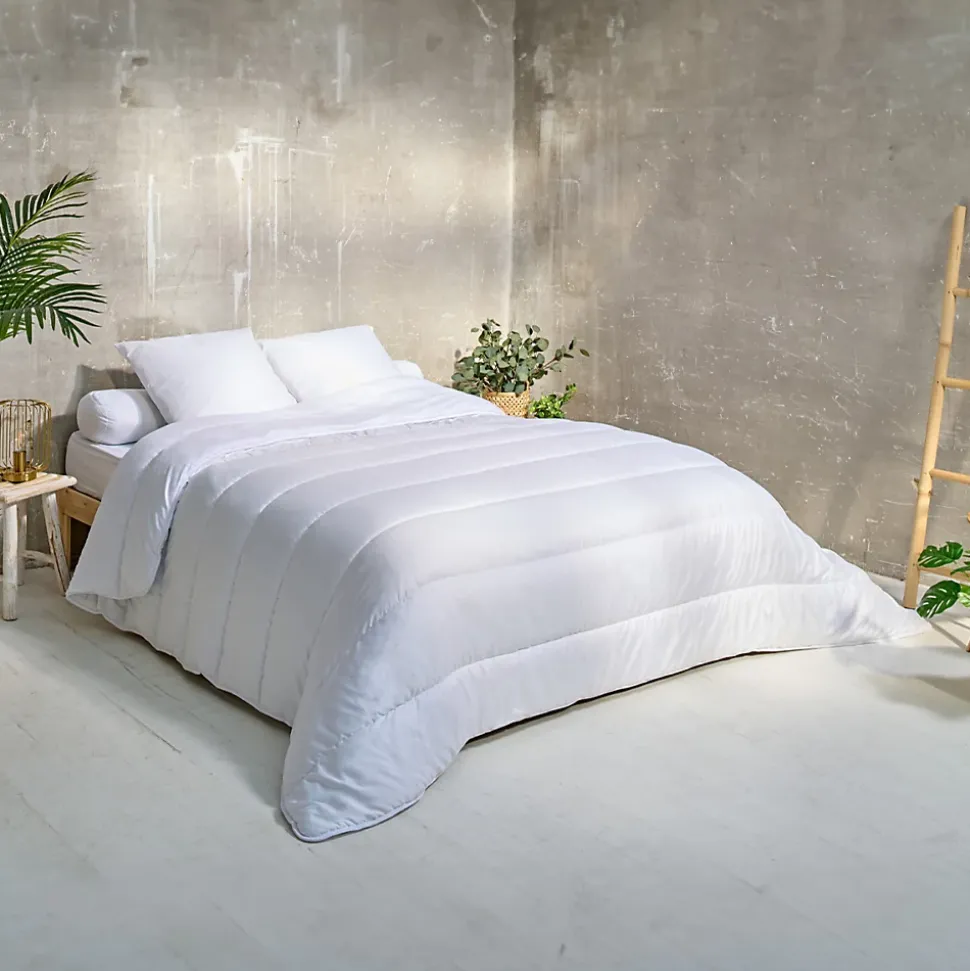 Couette Chaude Garnissage 350 g/m² polyester fibre creuse siliconée – Enveloppe microfibre 100% polyester traité Sanitized anti-acariens , antibactérien Fabriqué en France Lavable en machine (40°) L’enveloppe microfibre 100% polyester au toucher peau de pêche bénéficie du traitement Sanitized anti-acariens et antibactérien. Ce traitement naturel résiste aux lavages, et il vous assure double protection durable. Avec son garnissage 350 g/m² polyester fibre creuse siliconée, cette couette chaude assure une excellente circulation de l’air et une évacuation optimale de l’humidité. Fabriquée en France, la couette Anti-Acarien affiche un très joli look avec son piquage ligne droite et sa finition biais. Cette couette hiver est disponible en taille 140x200cm, 200x200cm, 220x240cm et 240x260cm. Pour un maximum de confort, choisissez-la une à deux tailles au-dessus de celle de votre matelas. Ce produit bénéficie d’un traitement biocide, principe actif tetradecyl dimonium cylan. Produit comportant au moins 90% de matières recyclés Produit majoritairement recyclable
