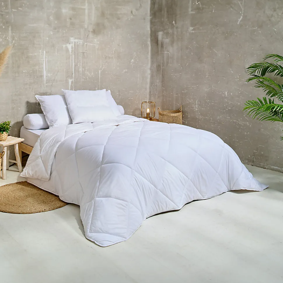 Couette Chaude Garnissage 400 g/m² polyester Enveloppe microfibre 100% polyester blanc Lavable en machine jusqu’à 95° Fabriqué en France Fabriquée en France, la couette Lavage Haute Température Les Ateliers du Nord associe une enveloppe microfibre 100% polyester blanc et un garnissage 400 g/m² polyester bien chaud pour l’hiver. Cette couette est conçue pour se laver et sécher en machine jusqu’à 95°. Le lavage à haute température constitue un moyen efficace de prévenir l’apparition d’acariens : cette couette d’hiver est donc idéale pour les personnes sujettes aux allergies. Vous assurant une hygiène irréprochable, elle est aussi recommandée pour les enfants. Avec son piquage losange et sa finition biais, cette couette bénéficie d’un joli gonflant. Elle est disponible en différentes tailles : pour un maximum de confort, choisissez-la une à deux tailles au-dessus de la taille de votre matelas. Ce produit est certifié de la norme OEKO-TEX Standard 100 – Testé pour les substances nocives Produit comportant au moins 90% de matières recyclés Produit majoritairement recyclable
