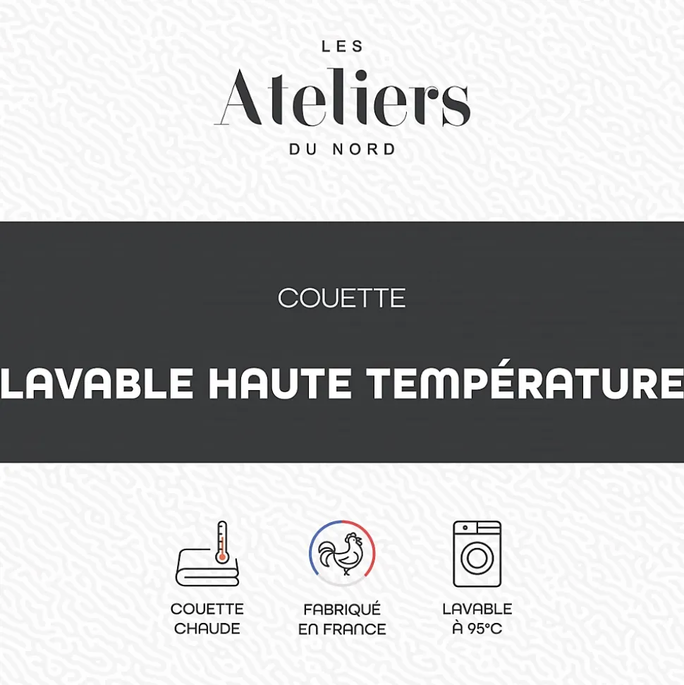 Couette Chaude Garnissage 400 g/m² polyester Enveloppe microfibre 100% polyester blanc Lavable en machine jusqu’à 95° Fabriqué en France Fabriquée en France, la couette Lavage Haute Température Les Ateliers du Nord associe une enveloppe microfibre 100% polyester blanc et un garnissage 400 g/m² polyester bien chaud pour l’hiver. Cette couette est conçue pour se laver et sécher en machine jusqu’à 95°. Le lavage à haute température constitue un moyen efficace de prévenir l’apparition d’acariens : cette couette d’hiver est donc idéale pour les personnes sujettes aux allergies. Vous assurant une hygiène irréprochable, elle est aussi recommandée pour les enfants. Avec son piquage losange et sa finition biais, cette couette bénéficie d’un joli gonflant. Elle est disponible en différentes tailles : pour un maximum de confort, choisissez-la une à deux tailles au-dessus de la taille de votre matelas. Ce produit est certifié de la norme OEKO-TEX Standard 100 – Testé pour les substances nocives Produit comportant au moins 90% de matières recyclés Produit majoritairement recyclable