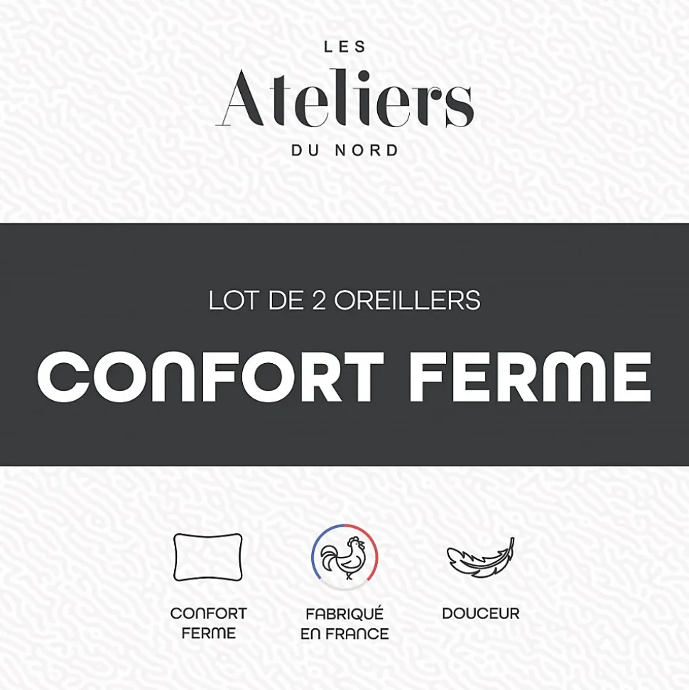 Confort ferme Garnissage 650 g Polyester fibre creuse siliconée Isolane Enveloppe 100% coton Fabriqué en France Lavable en machine (40°) Économique et pratique, le lot de 2 Oreillers Confort Ferme des Ateliers du Nord se compose de deux modèles carrés de 60×60 cm. Ces oreillers fabriqués en France bénéficient d’une enveloppe 100% coton d’une grande douceur et respirante. Leur garnissage Polyester fibre creuse siliconée Isolane permet d’assurer une excellente circulation de l’air, pour une évacuation optimale de l’humidité et un séchage facilité lors des lavages. Offrant un confort ferme, ces oreillers sont particulièrement recommandés si vous dormez habituellement sur le dos ou sur le côté. Ce produit est certifié de la norme OEKO-TEX Standard 100 – Testé pour les substances nocives Produit comportant au moins 90% de matières recyclés Produit majoritairement recyclable