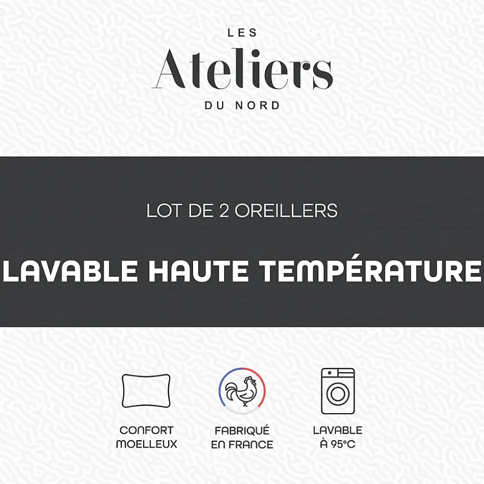 Lot de 2 Oreillers Lavage Haute Température 60x 60 cm Confort moelleux Lavage en machine jusqu’à 95°C Fabriqué en France Pour profiter d’un lit bien frais, avec le lot de 2 Oreillers Lavage Haute Température Ateliers du Nord. Cet ensemble économique se compose de deux oreillers carrés 60×60 cm. Ils sont conçus pour se laver en machine et supporter une température allant jusqu’à 95°C, ce qui permet de prévenir efficacement l’apparition d’acariens. Les oreillers Lavage Haute Température constituent ainsi un très bon choix si vous avez des problèmes d’allergie. Avec leur garnissage 550 g, ces oreillers gonflants vous assurent un confort moelleux. Ce produit est certifié de la norme OEKO-TEX Standard 100 – Testé pour les substances nocives Produit comportant au moins 90% de matières recyclés Produit majoritairement recyclable