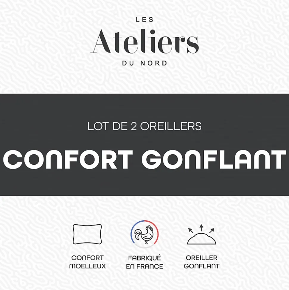 Lot de 2 oreillers Confort Gonflant Confort moelleux Garnissage 550 g Polyester fibre creuse siliconée Isolane Enveloppe 100% coton Fabriqué en France Lavable en machine (40°) Proposé dans un format économique, cet ensemble se compose de 2 Oreillers Confort Gonflant format carré 60x60cm. Ces oreillers moelleux fabriqués en France se composent d’une enveloppe 100% coton douce et respirante et d’un garnissage en Polyester fibre creuse siliconée Isolane. Cette technologie assure une circulation de l’air optimale, qui facilite l’évacuation de l’humidité. Avec leur gonflant exceptionnel, les oreillers Confort Gonflant les Ateliers du Nord vous assurent un confort de sommeil optimal. Doux et agréables au toucher, ils apportent une touche douillette à votre literie. Ce produit est certifié de la norme OEKO-TEX Standard 100 – Testé pour les substances nocives Produit comportant au moins 90% de matières recyclés Produit majoritairement recyclable