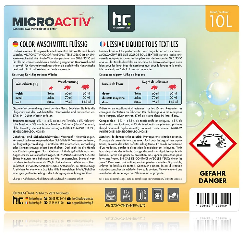 10 l de lessive liquide pour le blanc et les couleurs de Höfer ChemieLa lessive liquide de la boutique en ligne de Höfer Chemie convient pour des températures comprises entre 30 et 95 °C. À la question « lessive liquide ou poudre ? », il convient de souligner que la lessive liquide Microactiv Color de Höfer Chemie, dans son bidon de réserve pratique de 10 litres, peut aussi parfaitement être utilisée pour le lavage à la main. En outre, la lessive liquide concentrée convient parfaitement comme lessive complète en raison de son pouvoir de dissolution des salissures supérieur à la moyenne.Dosage de la lessive liquide Höfer ChemieLes taches tenaces peuvent être trempées pendant la nuit dans la lessive liquide de Höfer Chemie. Ainsi, le nettoyage du linge à la température de lavage souhaitée sera encore plus efficace le lendemain. Pour le lavage à la main, il suffit d’environ 40 ml de lessive liquide pour 10 l d’eau. Le dosage exact de la lessive couleur et de la lessive complète dépend du degré de salissure du linge et de la dureté de l’eau dans la région. Veuillez consulter le tableau ci-dessous pour connaître le dosage recommandé de la lessive liquide Höfer Chemie. Le bidon pratique d’une contenance de 10L suffit pour plus de 100 charges de lavage individuelles !Prétraitement ciblé directement sur la tache. Veuillez respecter les consignes d’entretien du fabricant de textiles.Lessive couleur en poudre ou liquide ?La lessive liquide Microactiv Color de Höfer Chemie se dissout parfaitement, même à des températures de lavage basses. Contrairement aux lessives en poudre, elle garantit un pouvoir nettoyant particulièrement élevé. Aucun dépôt de poudre de lavage mal dissoute ne reste sur le linge, ce qui permet de laver le linge avec peu d’eau tout en respectant l’environnement.Remarques supplémentairesEn règle générale, les lessives doivent être tenues hor…