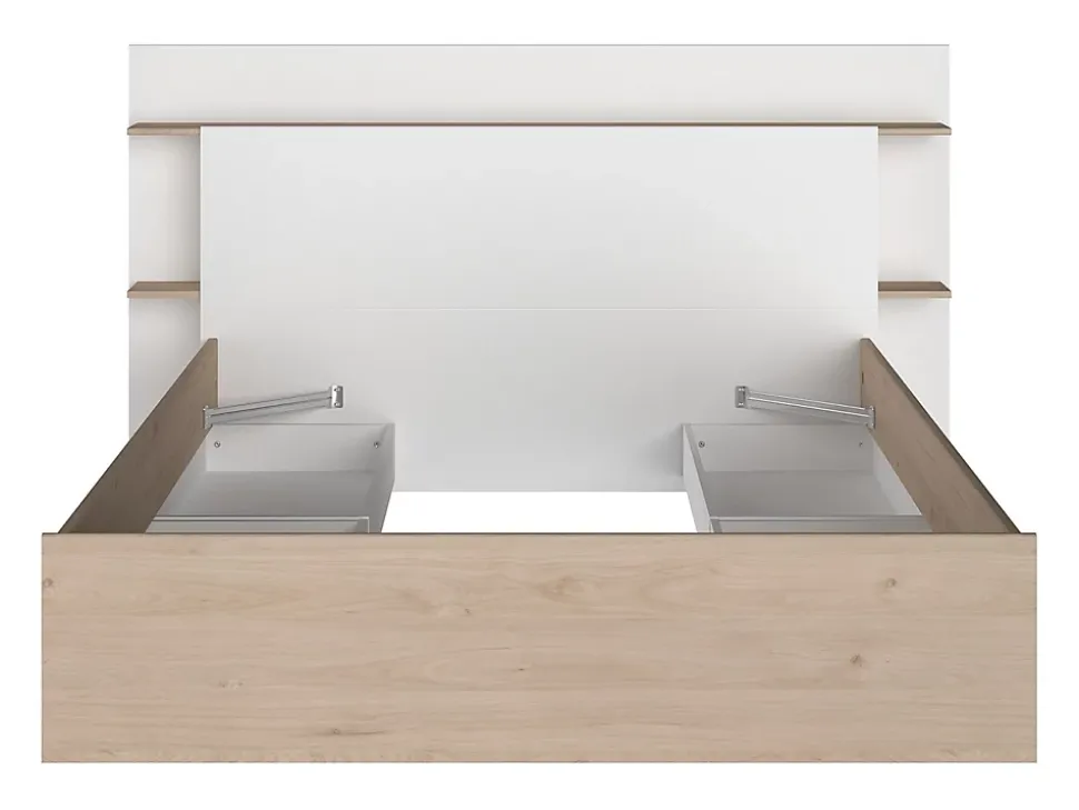 - Lit 140 x 190/200 cm avec 4 tiroirs – Structure : Panneaux de particules – Coloris : Naturel et blanc – Dimensions : L184 x P221,5 x H96,6 cm – Style : Moderne + Sommier + Matelas – Confort et rangement optimisés avec TILONIDE !