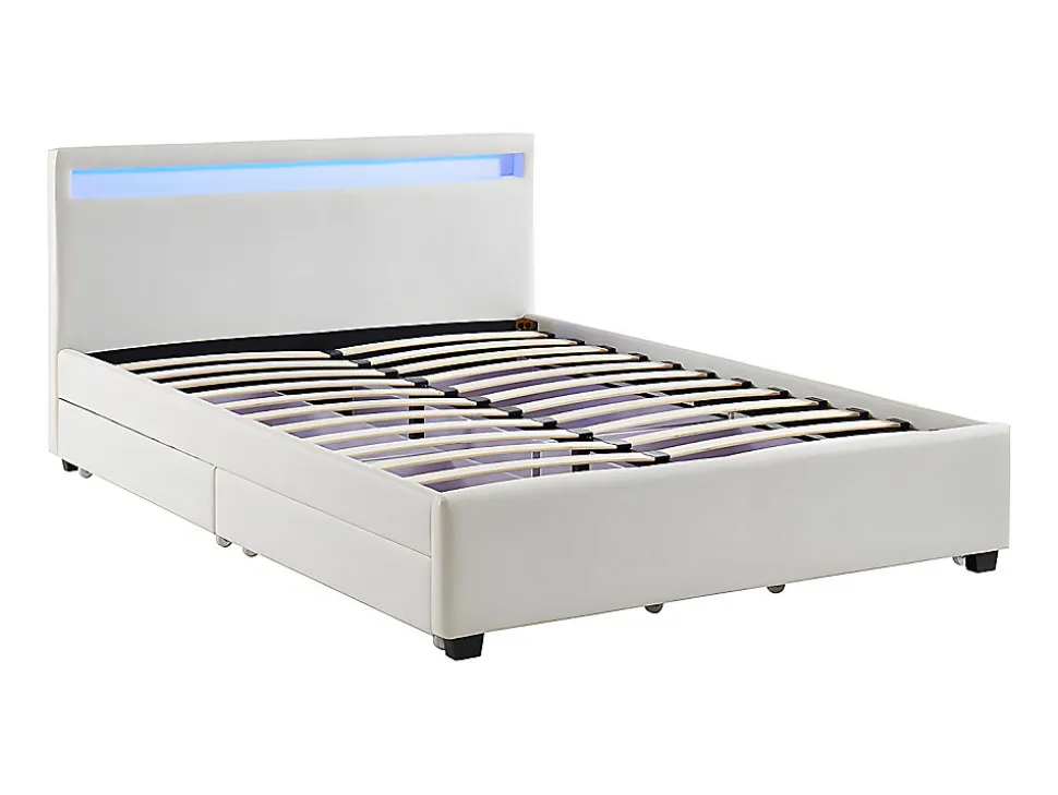- Lit ALOIS II avec rangements – 140 x 190cm – Simili blanc – Avec LEDs 4 couleurs : bleu, blanc, rouge, vert. Dimensions : L205 x P151 x H85 cm. Style : Moderne – Succombez aux multiples facettes du lit ALOIS II !