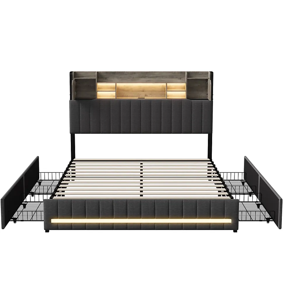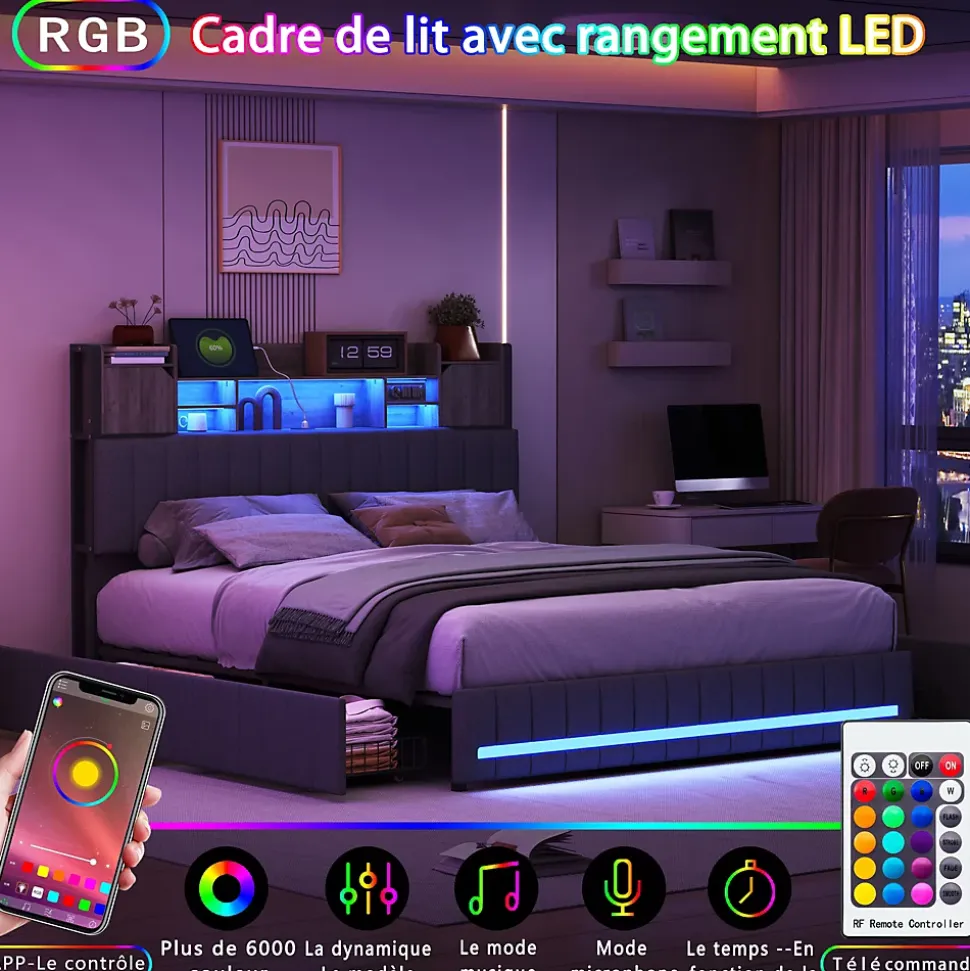 Tête de lit avec ports USB : l’une des caractéristiques les plus pratiques est la prise intégrée à la tête du lit, avec laquelle vous pouvez charger votre téléphone portable et votre tablette avant d’aller vous coucher. Éclairage LED : l’éclairage LED ajoute un style moderne à votre chambre à coucher, avec la télécommande, vous pouvez changer les différentes couleurs et luminosités pour vous allonger confortablement.Design de rangement : le lit est équipé de 4 tiroirs de grande capacité. Les deux côtés du lit sont équipés de boucles de tiroir qui permettent de fixer fermement le tiroir au lit lorsque le tiroir n’est pas utilisé pour que votre chambre soit bien rangée. Les boîtes de rangement se déroulent et se déroulent facilement grâce aux roulettes au sol.Pratique et design : le lit allie habilement design élégant et confort optimal. La structure du lit est principalement en fer, durable et a une capacité de charge allant jusqu’à 600 lbs. Les pieds de support supplémentaires de la barre centrale peuvent assurer la stabilité fiable du lit.Rangement sur la tête de lit : il s’agit d’un nouveau lit rembourré qui combine deux fonctions : décoration et rangement LED. L’espace de rangement sur le lit est divisé en une zone interne et une zone externe, avec 10 compartiments externes de différentes capacités pour les besoins quotidiens. La partie rembourrée au milieu du lit peut être ouverte pour ranger des objets plus grands.Détails du produit :Dimensions totales : 145 x 207.5 x 126 cm (l x l x H).Matériau du panneau : matériau de linCouleur : grisMax. Poids de l’utilisateur: 300kgType de charge : 2 USBBoxspring requis : aucun.Montage requis: OuiContenu de la livraison : structure de lit + USB + tiroirs.Design unique : USB + tiroirsMatelas applicable (matelas non inclus) : 140 x 190 cmQuantité du colis : 2.