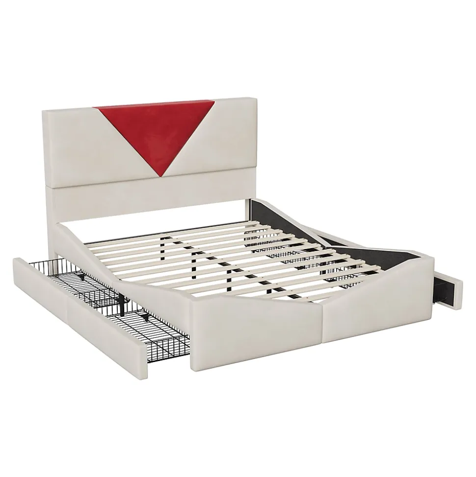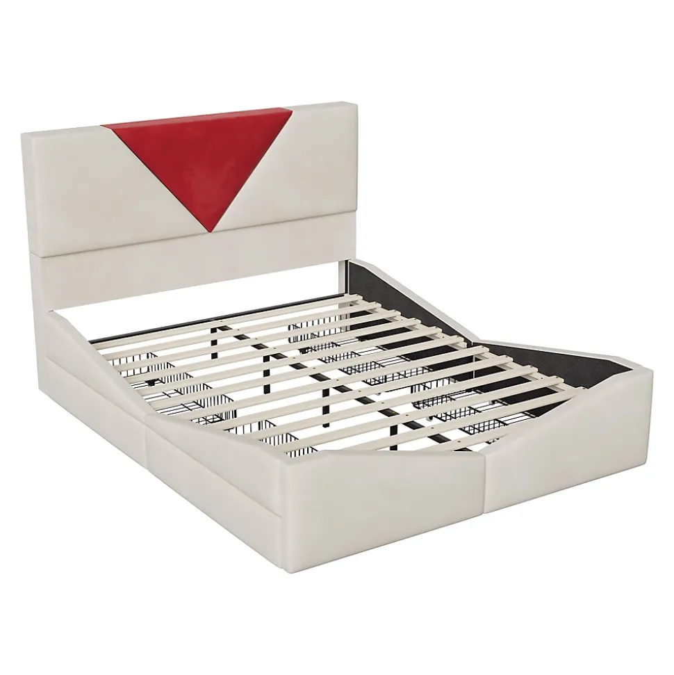 Grand rangement intégréLe lit dispose d’espaces de rangement sur les côtés et au pied, permettant de stocker couettes, vêtements ou articles saisonniers, pour un espace de chambre toujours organisé. Tête de lit bicolore designLa tête de lit beige avec motif triangulaire bordeaux apporte un contraste élégant et moderne, transformant le lit en véritable pièce décorative.️ Structure solide et durableCadre en bois de qualité renforcé par des éléments métalliques, associé à un sommier à lattes, pour une stabilité renforcée et un soutien uniforme.️ Confort doux en veloursLe revêtement en velours beige offre une sensation douce et luxueuse au toucher. Le rembourrage enveloppant de la tête de lit et du cadre apporte un confort agréable pour se reposer ou s’adosser. Montage simple et rapideDesign modulaire avec instructions claires et tutoriel vidéo. Même sans expérience, l’assemblage se fait facilement en peu de temps.