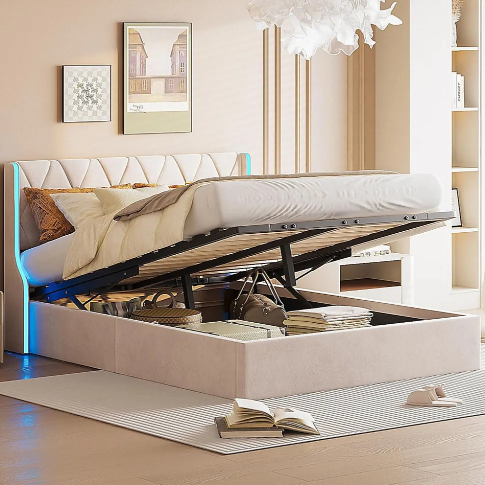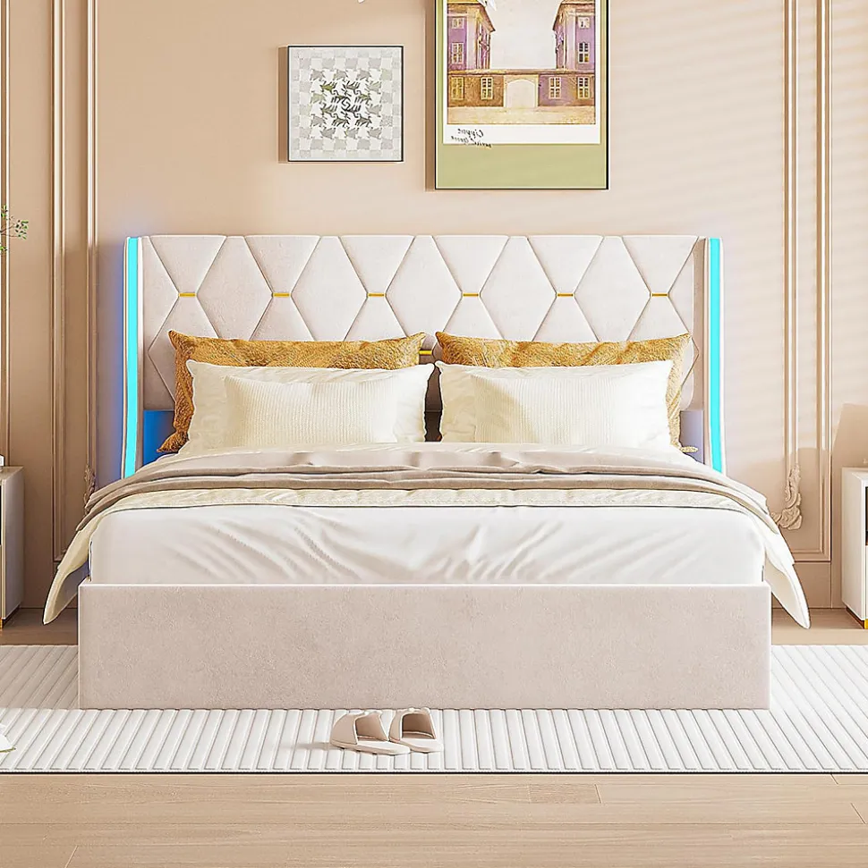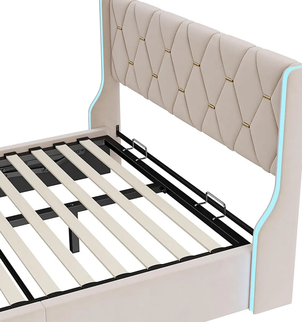 【Conception LED】 L’éclairage LED intégré à la tête de lit offre une lumière agréable aux chambres des adolescents. Vous pouvez facilement régler sa luminosité et sa couleur à l’aide de la télécommande.【Design élégant】conçu dans le style Chesterfield, le look est magnifique et tamisé. La tête de lit plus haute vous offre un soutien plus stable et plus confortable de la tête et du dos. Le lit rembourré est fabriqué en velours qui est doux pour la peau et doux au toucher, vous offrant une expérience de sommeil parfaite.【Structure robuste】 le cadre de lit est en bois de qualité supérieure, cadre en acier et éléments de fixation. Le support est massif et est composé de pin massif et de supports centraux en acier. Les lattes plus épaisses offrent un soutien optimal pour votre propre matelas. Contenu du lit capitonné : cadre de lit, sommier à lattes, notice de montage.【Levier hydraulique】 Sous le sommier à lattes pliant se trouve un grand coffre de lit. Il y a suffisamment d’espace de rangement pour y placer des couvertures, des oreillers ou des draps. Grâce à des vérins à gaz, le sommier à lattes peut être plié facilement.【Facile à assembler】Les dimensions totales du lit sont de 203 x 149 x 105 cm, avec une capacité de charge de jusqu’à 350 kg. SpécificationTaille du produit : 203 x 149 x 105 cmMatelas recommandé : 140 x 190 cm (sans matelas)Nombre de lattes : 24Matériau du produit : Velours+Bois+MétalCapacité de charge : 350 kgNombre de colis : 2