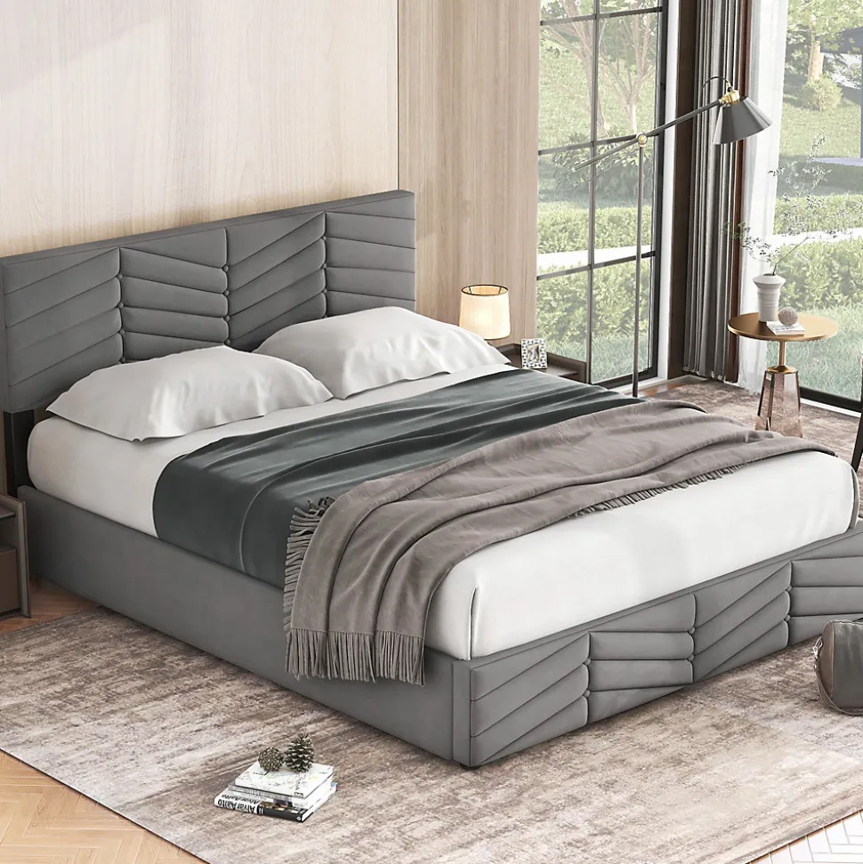 - Design européen en velours gris agrémenté de rayures et de boutons sur tête et pied, grand dossier matelassé offrant un appui confortable et une intégration sobre dans diverses décorations.