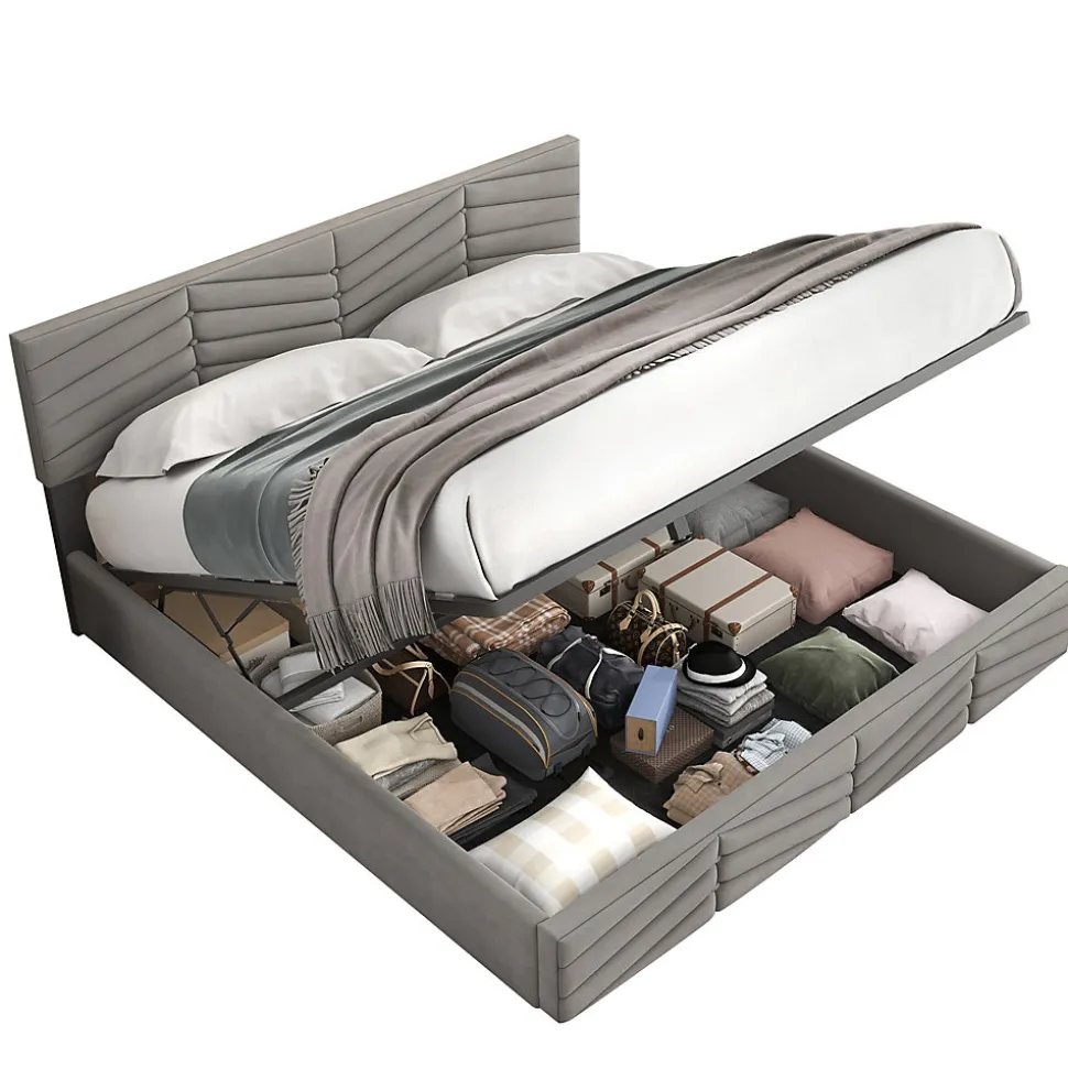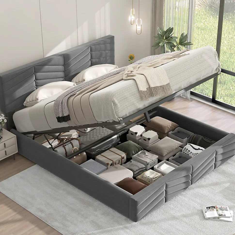 Design & styleCe lit en velours gris combine un style européen contemporain et des détails décoratifs à rayures et boutons sur la tête et le pied. Sa finition douce et son large dossier offrent une assise confortable pour lire ou se détendre, tout en apportant une présence chaleureuse et élégante à la chambre.Fonctionnalité & rangement Système de rangement par ouverture hydraulique : le sommier se lève facilement pour accéder à un vaste coffre de rangement sous le lit, pratique pour linges de lit, couvertures et vêtements. Conception pensée pour un usage quotidien : accès simple et sécurisé grâce au mécanisme assisté, permettant d’optimiser l’espace de la chambre.Matériaux & entretienRevêtement en velours doux, mousse de garnissage confortable et structure interne solide. Surface facile d’entretien : dépoussiérer à l’aide d’un aspirateur à faible puissance ou nettoyer avec un chiffon humide. Eviter les produits agressifs.Dimensions & spécifications Type de produit : Lit tapissé sans matelas, sommier à lattes inclus Dimensions du lit : 140×190 cm (taille du couchage) Dimensions produit : 190×145,5×90-95 cm (longueur x largeur x hauteur ; tête de lit réglable de 90 à 95 cm) Hauteur réglable de la tête de lit : ajustable de ±5 cm pour s’adapter aux besoins de confort Poids net : 37 kg • Capacité maximale recommandée : 300 kgInstallation & livraisonProduit livré démonté en 2 colis pouvant arriver séparément. Montage requis, deux personnes recommandées pour un assemblage sûr et rapide selon la notice fournie. Matelas non fourni. En cas de question lors du montage, contacter le service indiqué sur la notice.