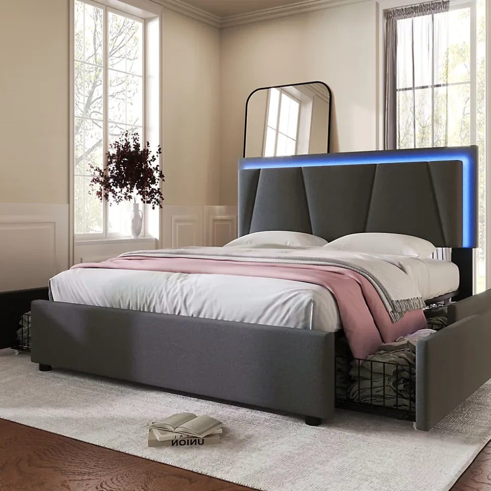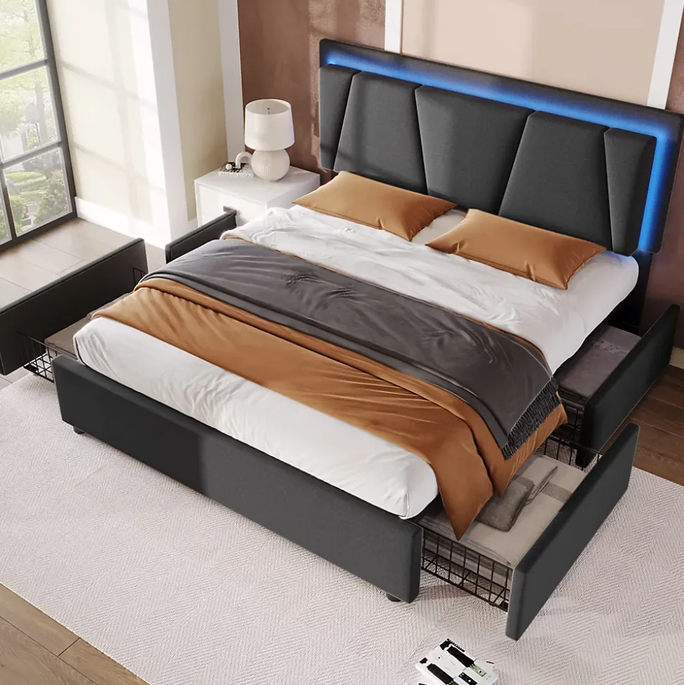 Design & styleCe lit 140×200 cm associe une silhouette contemporaine et une tête de lit géométrique rembourrée en tissu type lin gris, rehaussée de boutons décoratifs. La combinaison métal/tissu apporte une présence élégante et discrète dans la chambre.Fonctionnalité & rangement Quatre grands tiroirs équipés de roulettes pour une ouverture et fermeture aisées ; dimensions intérieures 74,5×49,5×15 cm pour un rangement modulable. Attaches latérales permettant de fixer les tiroirs au cadre lorsque non utilisés, contribuant à un maintien soigné et à une chambre ordonnée. LED intégrée à la tête de lit avec télécommande pour régler couleurs et intensité et créer une ambiance adaptée au repos.Matériaux & soliditéCadre principalement en métal pour une tenue durable et stabilité renforcée par des pieds de support centraux ; sommier à lattes en bois compatible avec la majorité des matelas 140×200 cm (épaisseur recommandée 25–35 cm). Charge maximale annoncée : 272 kg.Dimensions & compatibilitéDimensions totales approximatives : 149x207x102–112 cm (LxP xH avec tête de lit réglable). Matelas non fourni. Compartiments internes et proportions conçus pour une utilisation quotidienne optimisée.Installation & emballageMontage requis, deux personnes conseillées. Produit livré en 2 colis pouvant arriver séparément ; vérifiez l’arrivée des deux paquets et contactez le service client en cas de pièces manquantes. Pour déplacer le lit, le soulever plutôt que le faire glisser afin de préserver la structure.