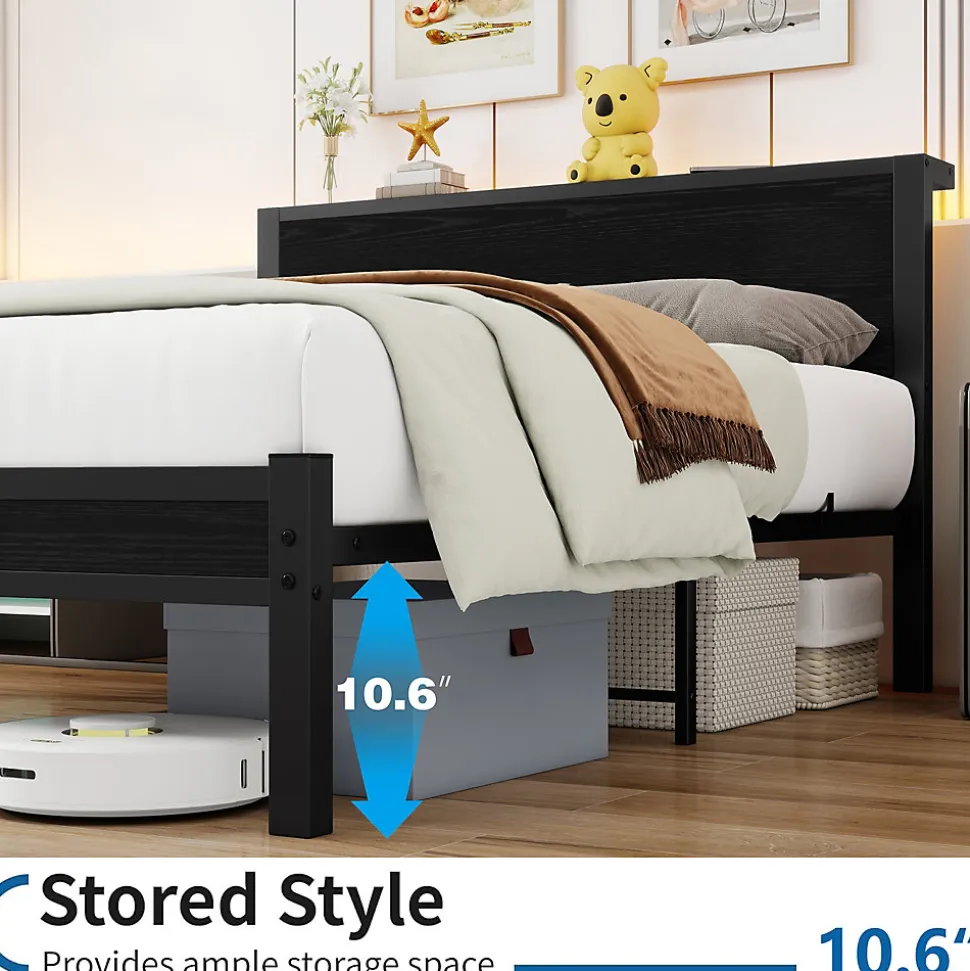 - Structure robuste en cadre métal noir avec 13 lattes métalliques et 9 pieds renforcés, tête et pied en MDF; support jusqu’à 220kg. Plateforme sans boxspring et 27 cm de rangement sous le lit.