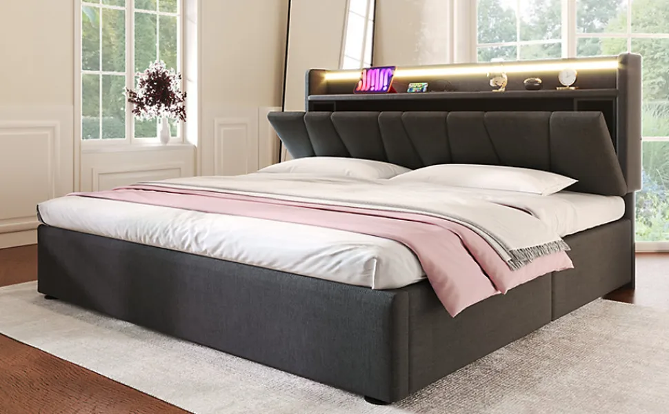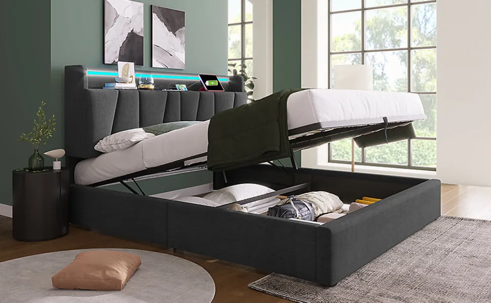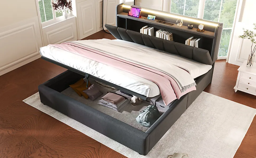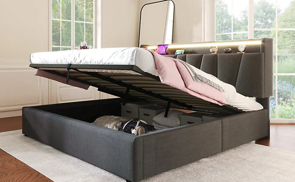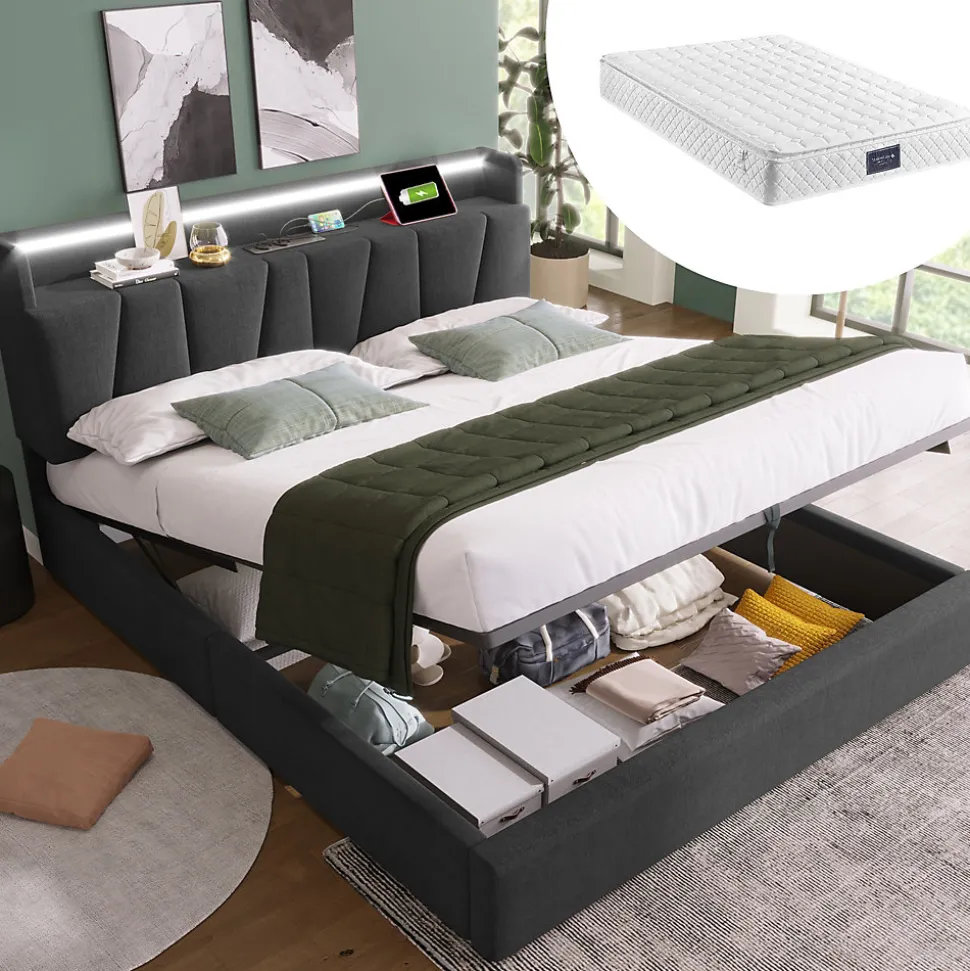 Design & styleLit tapissé en lin gris au style contemporain, lignes sobres et proportions étudiées pour s’intégrer facilement à différents décors. La tête de lit intègre des espaces de rangement discrets pour conserver l’ordre sans encombrer la pièce.Fonctionnalité & rangementConçu pour optimiser l’espace, ce modèle propose des niches pratiques dans la tête de lit et un vaste volume de stockage sous les lattes, accessible grâce à un système de vérins à gaz. La tête de lit dispose de 2 prises électriques, d’un port USB et d’un port Type‑C pour recharger téléphone, tablette et autres appareils au chevet. Compatible avec un matelas 140×200 cm (matelas non fourni).Matelas & confort recommandéPour un couchage adapté, on peut associer un matelas 140x200x25 cm à structure 7 zones et noyau ressorts/tissu mousse (ex. 620 ressorts, deux épaisseurs de mousse) offrant soutien et ventilation. Housse en polyester confortable et traitée pour une bonne circulation de l’air; convient aux personnes sensibles à la poussière domestique.Matériaux & entretienCadre principal en métal pour la stabilité, lattes en bois massif pour un soutien élastique et tapisserie en lin gris. Textiles testés selon le standard Öko‑Tex 100. Entretien simple : dépoussiérage régulier et nettoyage local avec un chiffon doux humide; éviter les produits agressifs.Installation & livraisonMontage requis, deux personnes recommandées. Produit livré en plusieurs colis (livraison possible en jours différents) ; soulever le lit pour le déplacer plutôt que le traîner. Capacité du cadre indiquée 400 lbs (≈181 kg). Avant un retour, merci de contacter le vendeur pour assistance ou pièces manquantes.