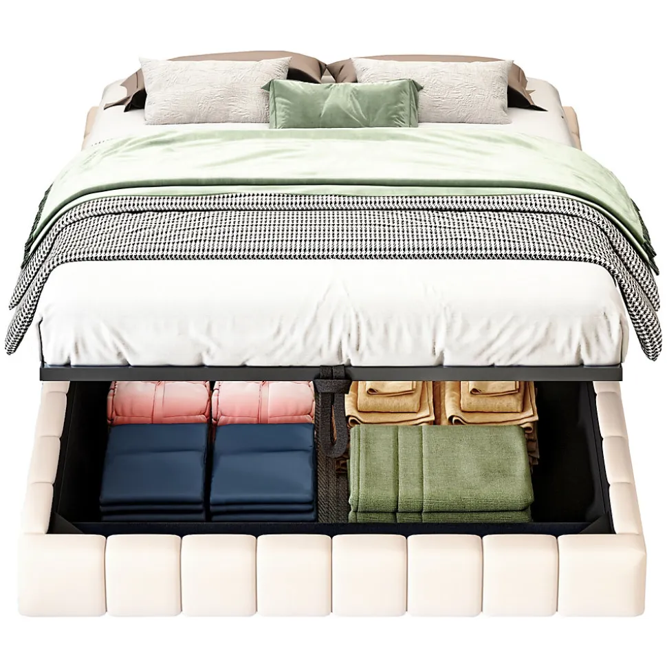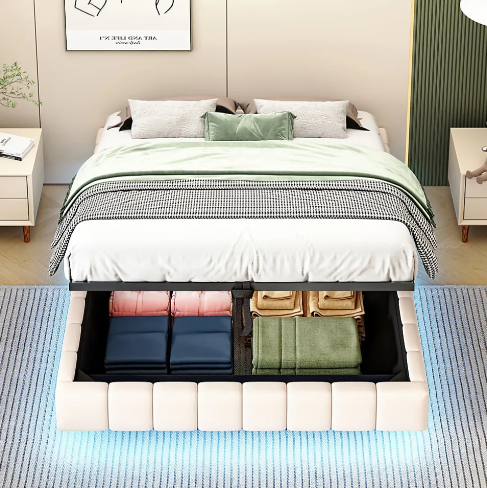 Design & styleCe lit tapissé offre un design contemporain avec un élégant effet flottant et une bande LED multicolore intégrée, réglable pour créer différentes ambiances lumineuses. Conçu sans tête de lit fixe, il s’adapte facilement à votre décoration.Fonctionnalité & rangement Système de levage hydraulique performant permettant d’accéder à un grand espace de rangement sous le sommier, idéal pour ranger couettes, oreillers et affaires saisonnières. Format lit 140×200 cm conçu pour optimiser l’utilisation de la pièce ; recommandation : vérifier l’image des dimensions avant montage. Capacité de charge élevée pour un usage quotidien, sans restriction particulière sur l’épaisseur de la matelas.Matériaux & constructionStructure composée de métal, panneaux en contreplaqué et MDF, sommier à 12 lattes et revêtement en tissu lin beige, agréable au contact et résistant à l’usure. Cadre solide offrant une capacité de charge maximale de 250 kg.Entretien & confortLe tissu en lin est aéré et facile à entretenir : dépoussiérage régulier et nettoyage local avec un chiffon humide. La conception propose un confort visuel et une finition propre adaptée aux intérieurs minimalistes ou contemporains.Installation & emballageMontage requis, deux personnes recommandées. Produit livré en 2 colis (poids total du colis env. 38 kg, poids net produit env. 33 kg). Durée de montage estimée : environ 2 heures ; notice et outils nécessaires fournis.