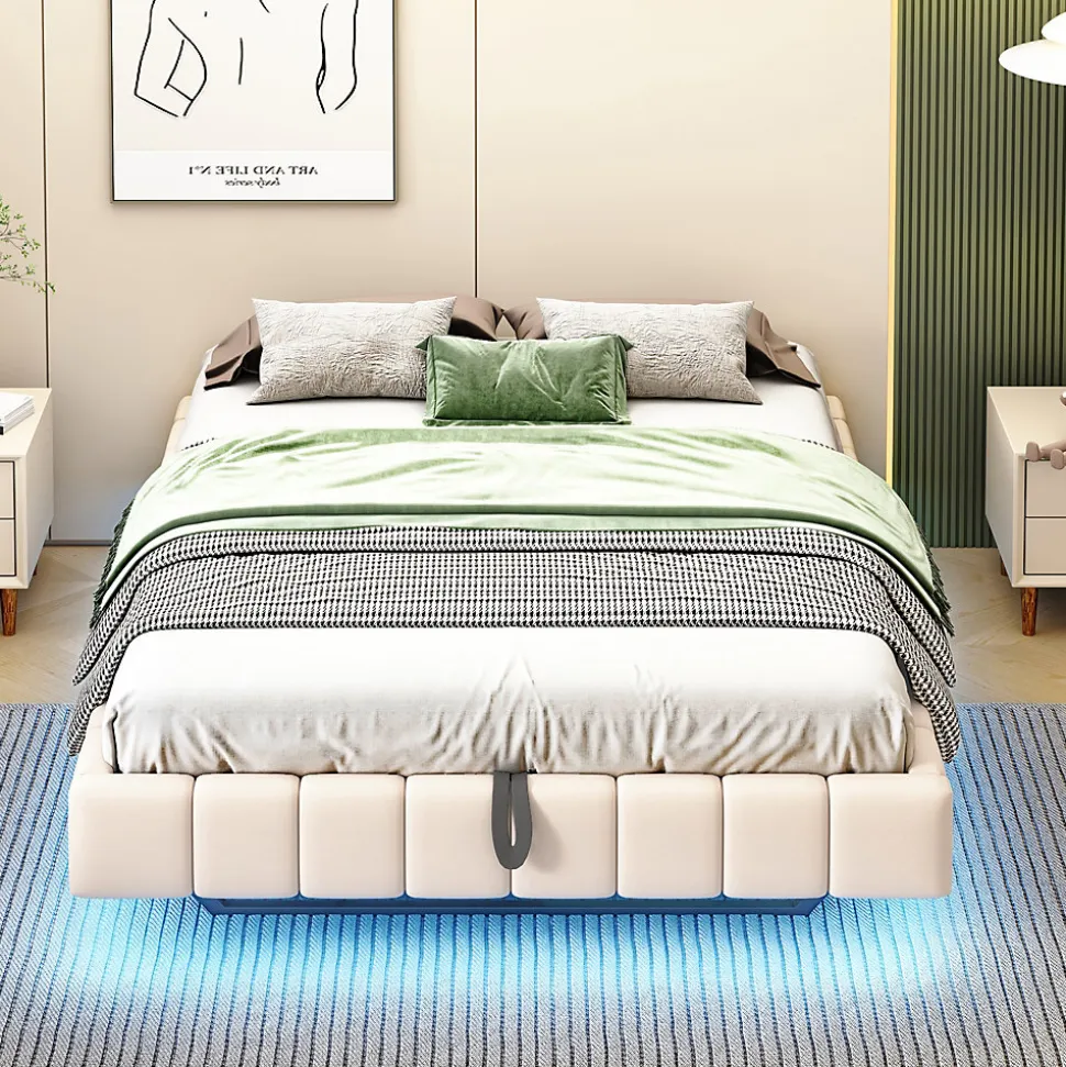 - Design moderne avec effet flottant et silhouette épurée : tapissé en lin beige agréable au toucher, bande LED multicolore réglable qui crée une lumière d’ambiance douce et personnalisable pour la chambre.