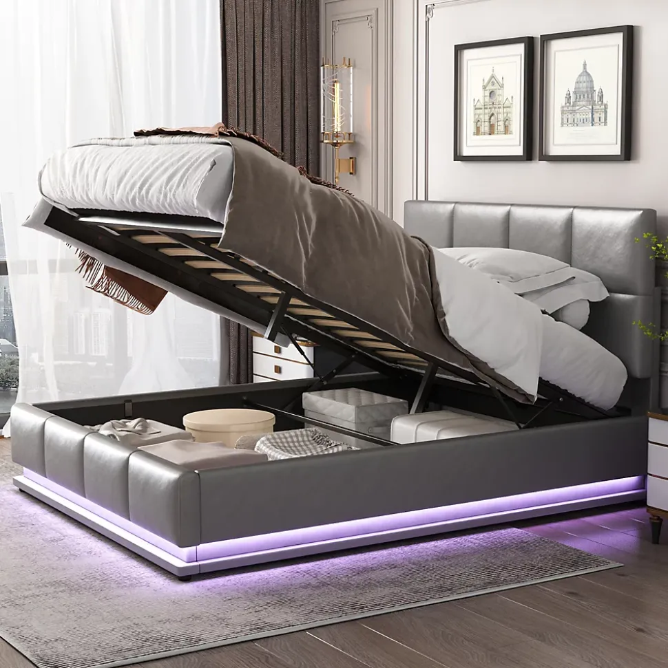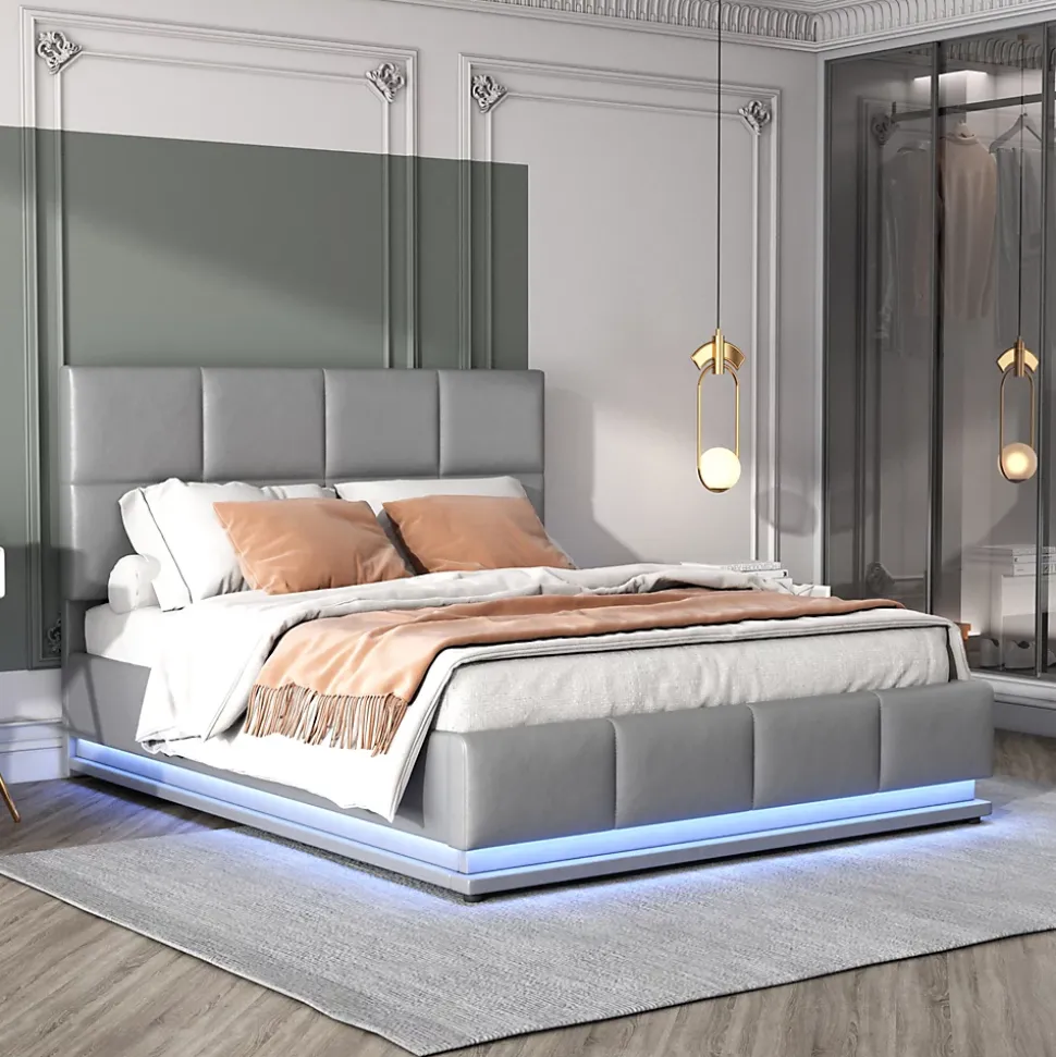 - Design contemporain en simili cuir gris, lignes sobres et tête de lit rembourrée ; éclairage LED intégré à 16 couleurs et 4 modes pour personnaliser l’ambiance sans effort.