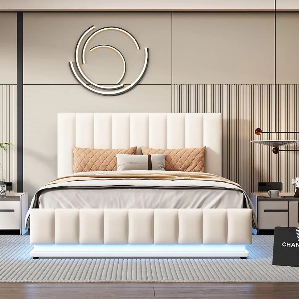 - Design contemporain tapissé en similicuir blanc avec tête de lit réglable et éclairage LED intégré ; télécommande 24 touches pour 16 couleurs et 4 modes automatiques, ambiance modulable.