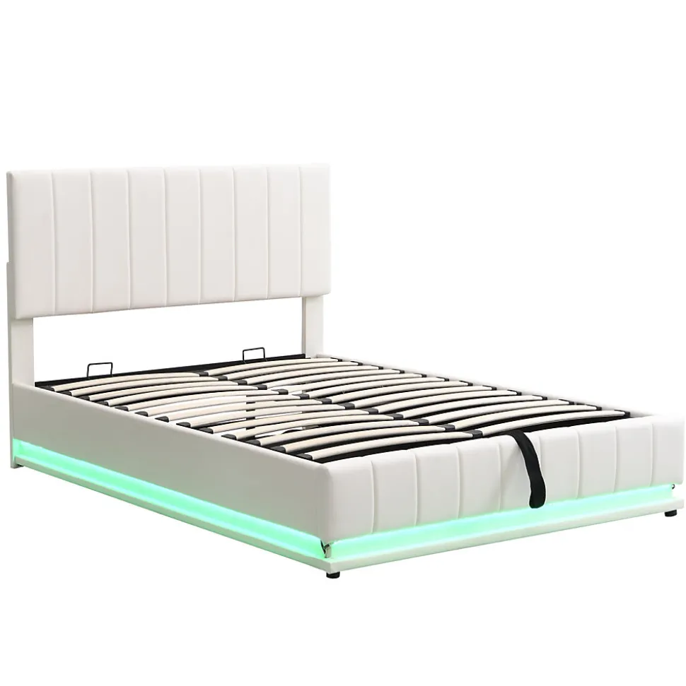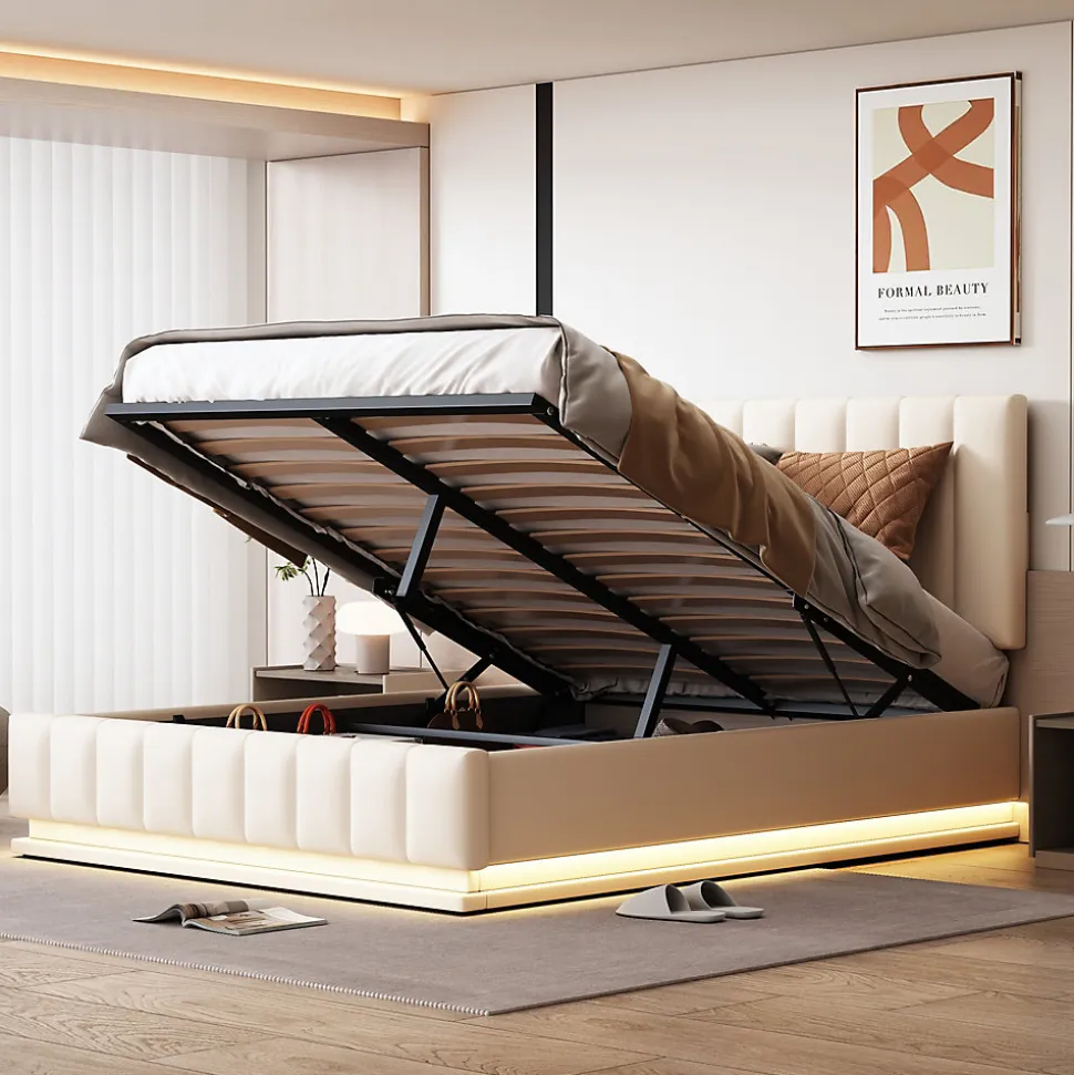Design & styleCe lit 140×200 cm combine un revêtement en similicuir blanc et une tête de lit réglable pour un rendu soigné et confortable. Les bandes LED intégrées offrent 16 couleurs et 4 modes automatiques, pilotables par une télécommande 24 touches pour adapter l’éclairage à chaque moment.Fonctionnalité & rangement 35 cm d’espace utile sous le sommier, idéal pour ranger couettes, oreillers et vêtements, équivalent à un grand volume de rangement. Mécanisme hydraulique double assurant une ouverture assistée, stable et sécurisée pour un accès aisé au coffre. Sommier à lattes métalliques conçu pour maintenir la structure sans affaissement et répartir la charge jusqu’à 250 kg.Matériaux & soliditéStructure réalisée en MDF et métal, recouverte de similicuir résistant. Renforts centraux et cadre robuste garantissent une bonne stabilité et une durabilité adaptée à un usage quotidien. Matelas non inclus.Entretien & confortSurface tapissée facile d’entretien : un chiffon doux suffit pour un nettoyage régulier. Le sommier offre un soutien ferme et homogène, contribuant à un couchage confortable et sécurisé.Installation & livraisonProduit livré en 2 colis (poids total indicatif 45 kg), les colis peuvent arriver séparément ; prévoir 2 à 3 jours si les envois sont distincts. Montage requis, estimé à environ 30 minutes à deux personnes ; outils courants fournis, aucun outil électrique nécessaire.