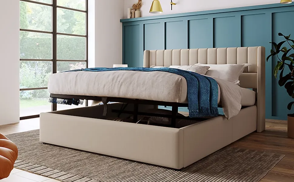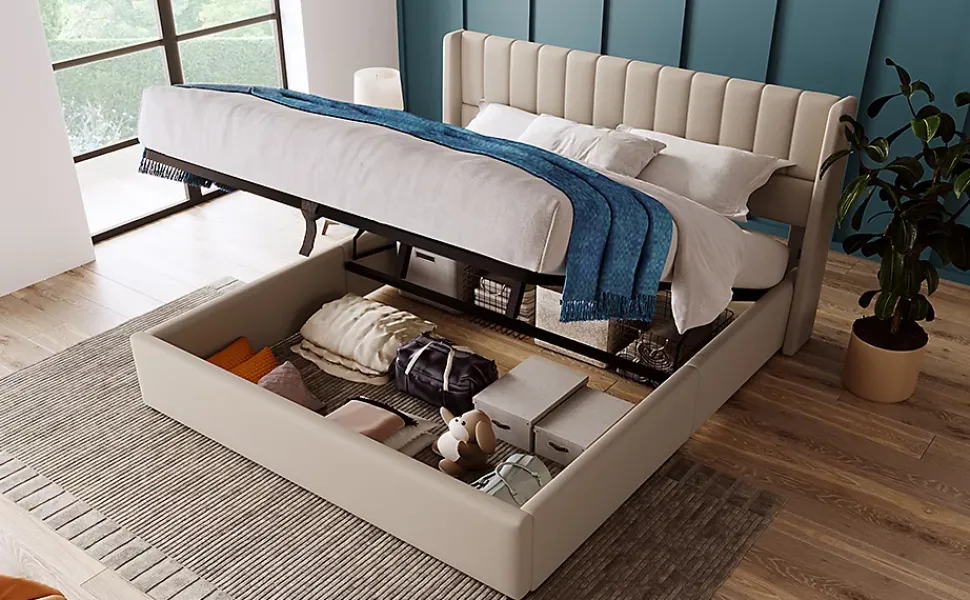 Design & styleCe lit en lin beige présente une tête de lit à rayures verticales et une bordure latérale courbée, pour un look moderne et élégant adapté aux intérieurs contemporains. Les lignes équilibrées et la finition textile apportent chaleur et sobriété.Fonctionnalité & rangement Sommier relevable par vérins hydrauliques offrant un coffre de rangement spacieux sous le lit, idéal pour housses, couettes et oreillers. Cadre composé de métal et panneaux en bois massif pour une stabilité renforcée et un usage quotidien sécurisé. Surface intérieure optimisée pour un accès pratique au rangement et maintien fiable du matelas grâce à la conception des bords.Matériaux & entretienRevêtement en lin beige, structure en métal et panneaux massifs. Tissus testés selon la norme OEKO‑TEX Standard 100, adaptés aux personnes sensibles. Nettoyage simple : essuyer avec un chiffon doux et sec ou légèrement humide.Dimensions & compatibilitéDimensions totales : 214,5x153x113 cm (L x P x H). Surface lit compatible : 140×200 cm. Charge maximale utilisateur indiquée : 181 kg. Convient à différents types de matelas 140×200 cm ; le matelas peut être acheté séparément.Installation & emballageMontage requis, deux personnes conseillées pour un assemblage sûr. Le produit est livré en plusieurs colis (3 cartons) pouvant arriver séparément ; vérifiez l’intégralité des pièces à la réception et contactez le service client si des éléments manquent.