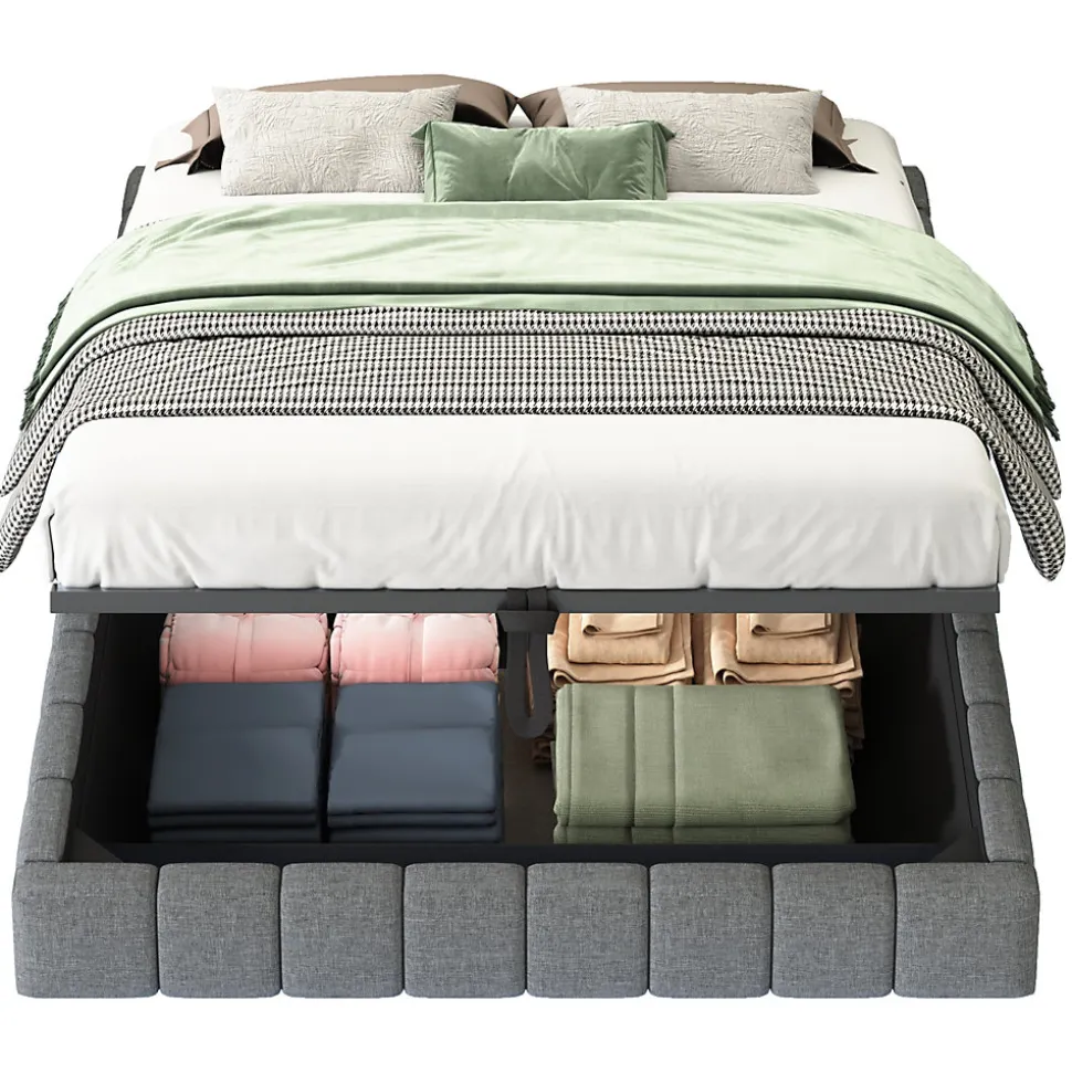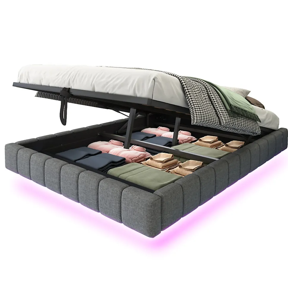 Design & styleCe lit tapissé propose une esthétique moderne et épurée avec un effet flottant qui allège visuellement la pièce. Le revêtement en tissu lin gris apporte une finition chaleureuse et un toucher agréable, s’adaptant à un intérieur scandinave, contemporain ou minimaliste. L’éclairage LED multicolore intégré est réglable pour favoriser une ambiance détendue ou plus dynamique selon l’usage.Fonctionnalité & rangement Sommier muni d’un système à vérin hydraulique pour accéder très facilement à un vaste espace de rangement sous le cadre, utile pour linge de lit, couvertures et rangements saisonniers. Structure conçue pour optimiser le volume utile de la chambre et faciliter l’organisation sans compromettre l’esthétique. Conception sans tête de lit fixe : possibilité d’ajouter différents types de têtes selon le style souhaité et l’espace disponible.Matériaux & entretienStructure en métal robuste associée à panneaux et MDF, recouverte d’un tissu en lin respirant, agréable au toucher et résistant à l’usure. Le cadre est conçu pour une charge maximale de 250 kg et intègre 12 lattes pour un soutien uniforme. Pour l’entretien, dépoussiérez régulièrement et nettoyez les salissures ponctuelles avec un chiffon doux légèrement humide.Dimensions & informations techniquesTaille du couchage : 140 x 200 cm. Dimensions extérieures : 201 x 141 x 31 cm. Poids du produit : environ 33 kg ; poids total des colis : environ 38 kg. Nombre de colis : 2. Produit disponible en plusieurs tailles selon vos besoins.Installation & emballageMontage requis, réalisé en environ 2 heures par deux personnes ; tous les éléments et outils nécessaires sont fournis (tournevis inclus). Le lit est livré en deux colis pouvant arriver séparément. Son assemblage et son usage quotidien offrent une solution pratique et stable pour optimiser le rangement et l’ambiance de la chambre.