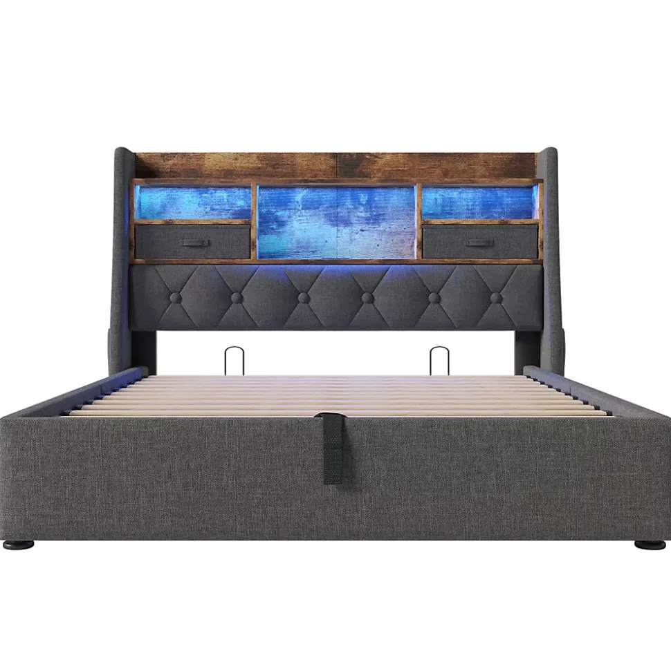 Design & styleCe lit 140×200 cm présente un style rétro élégant avec larges flancs courbés et dossier capitonné. La tête de lit intègre une étagère au ton chaleureux et un revêtement en tissu lin gris, conçu pour s’harmoniser avec de nombreux intérieurs. Dimensions totales du cadre : 221 x 152,5 x 116 cm.Fonctionnalité & rangement Mécanisme hydraulique pour un accès facile au grand coffre de rangement sous le sommier, sangles d’ouverture incluses. Rangements complémentaires : étagère de tête, tiroir en tissu et poches latérales pour smartphone, livres et accessoires. Sommier à lattes intégré et deux butées en U au niveau de la tête pour maintenir la matelas (matelas non fourni).Éclairage & connectivitéBandes led intégrées offrant plus de 60 000 couleurs, pilotables via application ou télécommande ; mode musique synchronisant l’éclairage au rythme. Tête de lit équipée de 3 ports USB (dont 1 charge rapide) et 1 port Type‑C pour recharger smartphones et tablettes.Matériaux & soliditéRevêtement en tissu lin gris, lattes massives et pieds métalliques assurent une bonne stabilité et une capacité d’usage durable. Structure renforcée et pièces de fixation prévues pour une pose sécurisée ; charge utilisateur maximale recommandée : 181 kg.Installation & livraisonMontage requis, deux personnes conseillées. Le produit est livré en 2 colis (possibilité d’arrivée séparée). Notice et outillage fournis dans l’emballage. En cas de pièces manquantes, contacter le service client. Entretien : nettoyer avec un chiffon humide et un détergent doux, puis essuyer à sec.