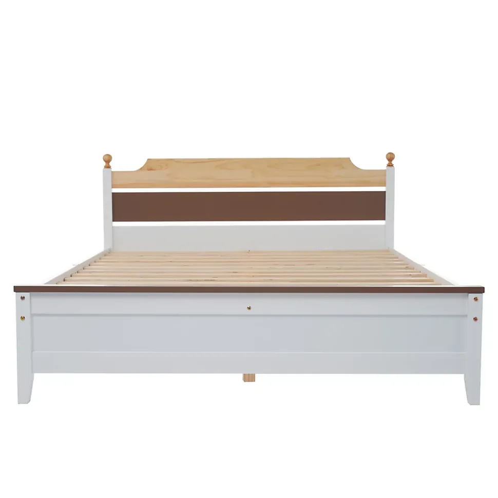 Design & styleCe lit double 140×200 cm présente une tête de lit en colour-blocking mêlant blanc, ton naturel et marron, associée à des pieds dotés de petites boules décoratives. L’alliance du pin massif et des panneaux MDF crée un rendu chaleureux et sobre, adapté à une décoration contemporaine comme plus traditionnelle.Fonctionnalité & structure Cadre en pin massif complété par éléments MDF et 13 lattes pour un soutien régulier de la literie et une bonne répartition du poids. Pieds centraux robustes apportant une stabilité renforcée et contribuant à la durabilité de l’ensemble. Conception pensée pour s’adapter à un matelas 140×200 cm (matelas non fourni) tout en limitant les points de pression.Matériaux & entretienStructure combinant pin massif et panneaux MDF avec finitions résistantes. Les surfaces se nettoient aisément avec un chiffon doux légèrement humide ; éviter les produits abrasifs et l’excès d’humidité pour préserver la qualité des matériaux.Dimensions, poids & origineDimensions totales : 210×147,5×82,5 cm. Poids approximatif : 28 kg. Charge recommandée : 100 kg. Compatible avec matelas 140×200 cm. Produit fabriqué en Chine.Installation & emballageMontage requis avec notice et pièces fournies ; assemblage conseillé à deux personnes pour plus de sécurité. Produit livré en 1 colis avec éléments prépercés pour faciliter l’installation. Vérifier le contenu à la réception avant assemblage.