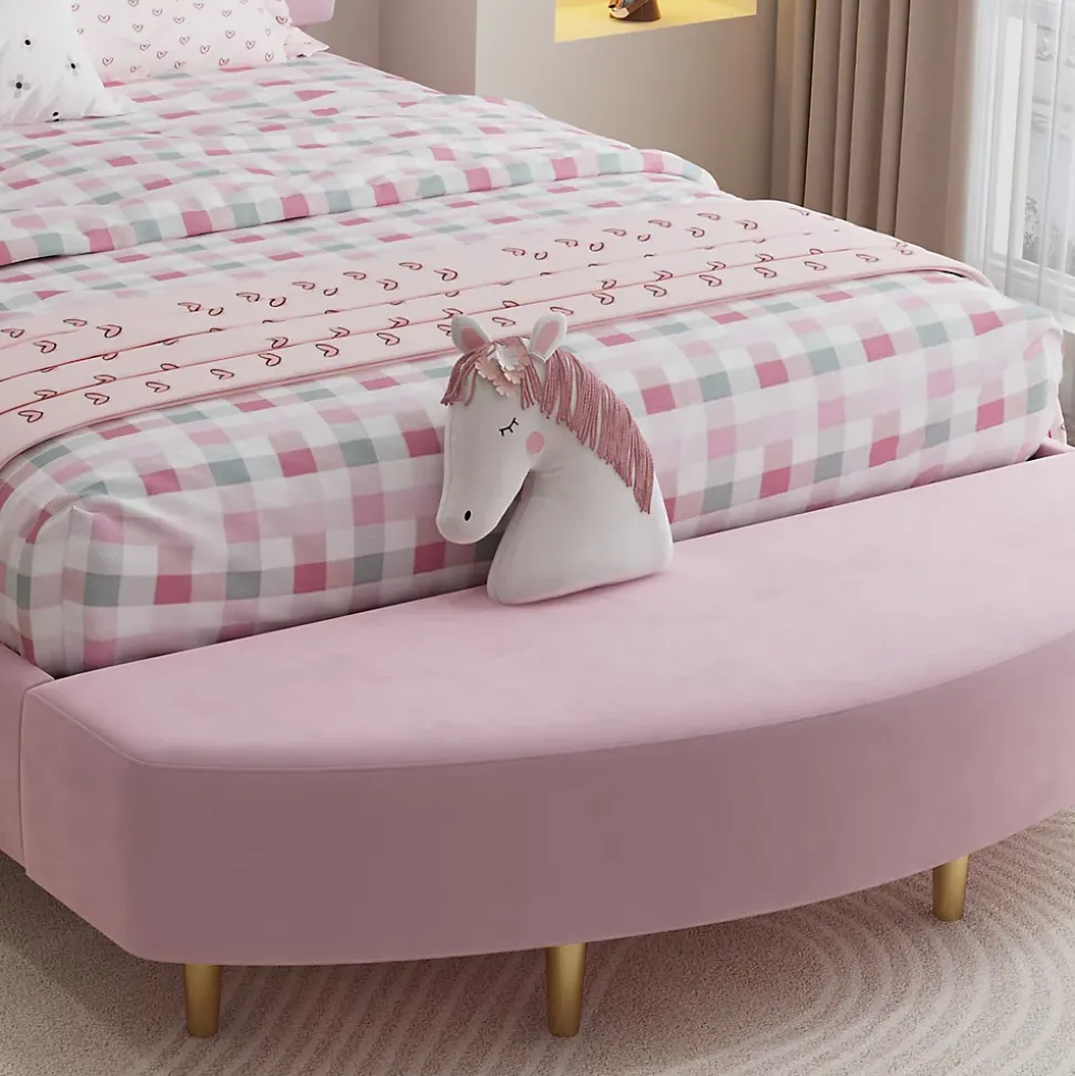 - Design élégant en velours rose avec tête de lit rembourrée et banquette coordonnée, apportant une atmosphère chaleureuse et une intégration discrète dans les ambiances modernes, minimalistes ou féminines.